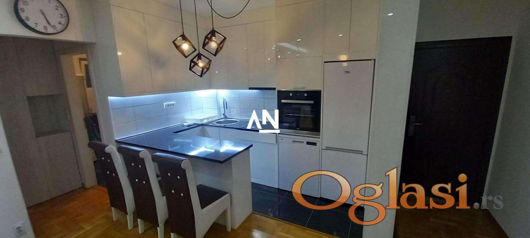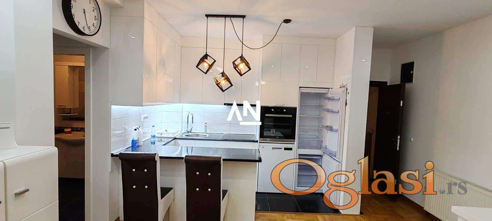 Nova, kompletno opremljena kuhinja sa mašinom za sudove i šankom. Market u zgradi, parking ispred.