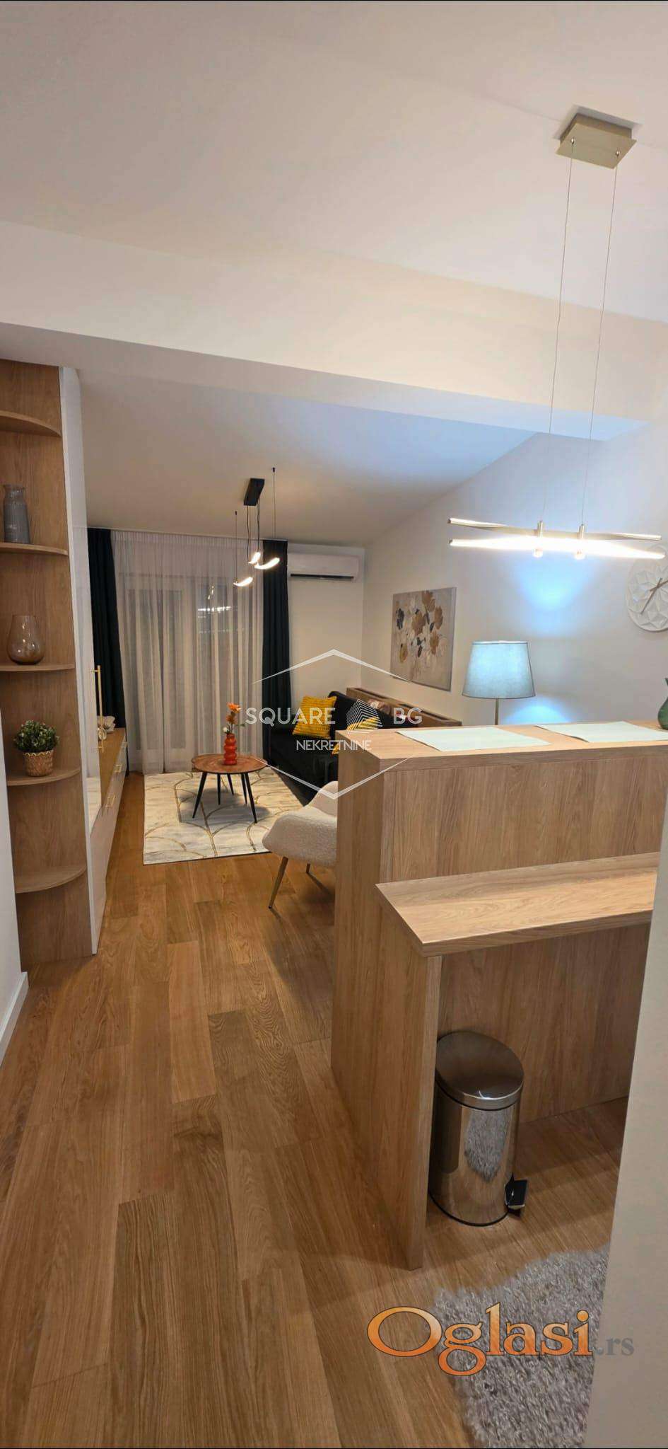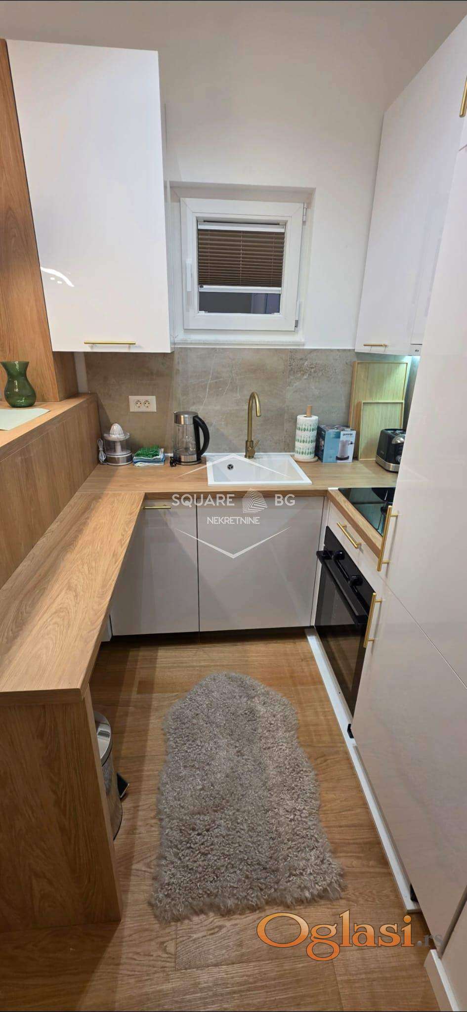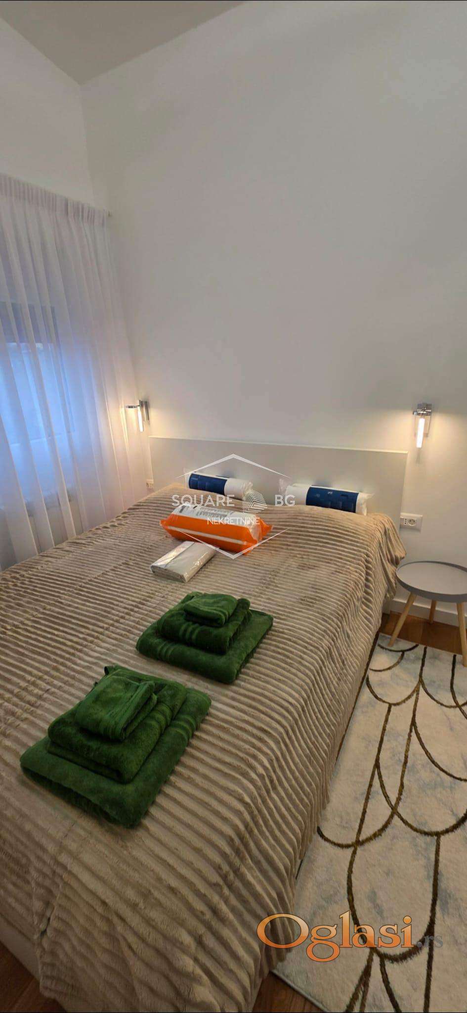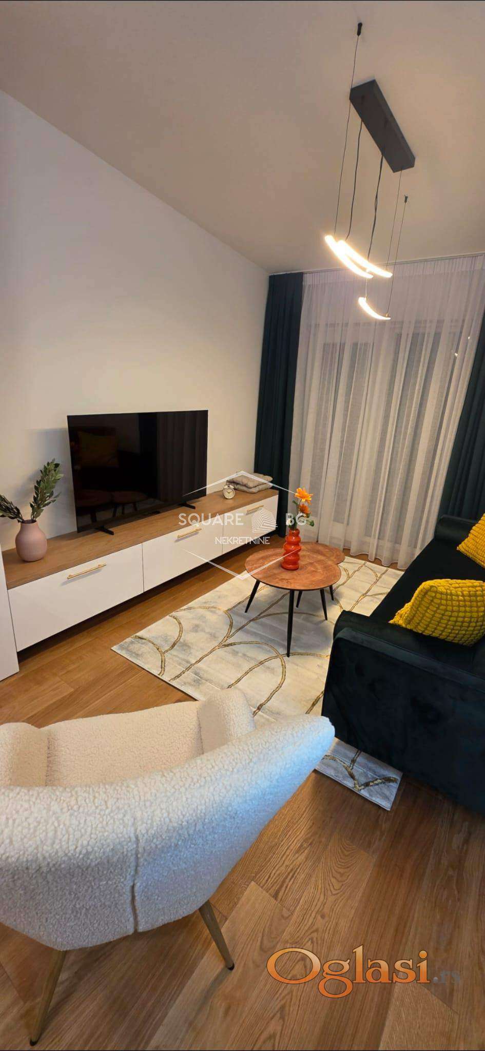 Stan je potpuno nov u novoj zgradi Beomarket. Na IV spratu od V spratova. Ima garazno mesto koje je ukljuceno u cenu. Full opremljen. Klijent treba samo svoje licne stvari da donese. Komplet bela i braon tehnika i mali kucni aparati. Komplet sudovi i escaj i case i soljice i serpe i tiganji. Ogrtaci za kupanje, papuce, 3 seta peskira. Video nadzor , klima, terasa sa setom za sedenje. Odvojena spavaca soba. 2 TV Smart Samsung. Kablovska i ultra brz internet. Odmah useljiv. 750 mesecno. Nisu dozvoljeni kucni liubimci. Stan je veoma svetao. Stan i terasa gledaju na jugo zapad sa sjajnim pogledom na Beograd. Agencijska provizija 50%