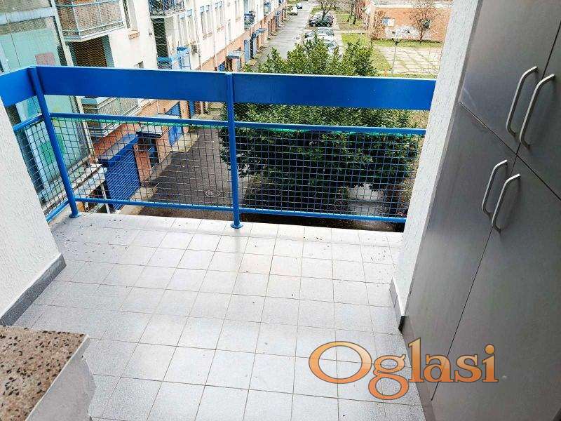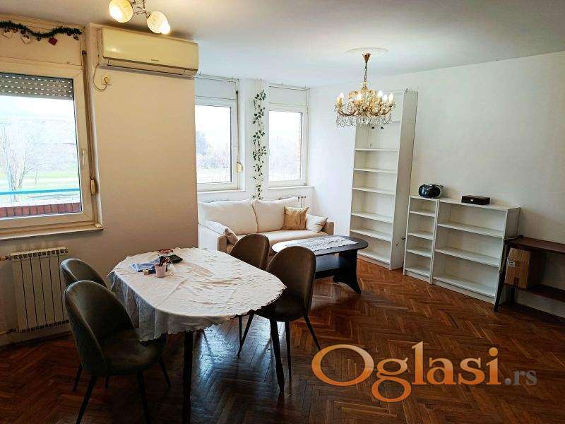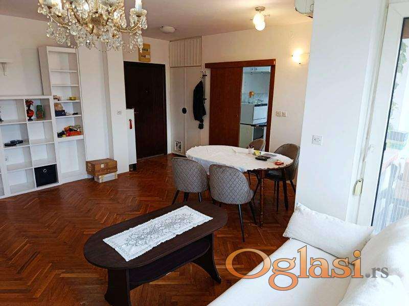 Trosoban kompletno opremljen, klimatizovan stan. Dvostrano orjentisan, sa dve terase. Odmah useljiv.