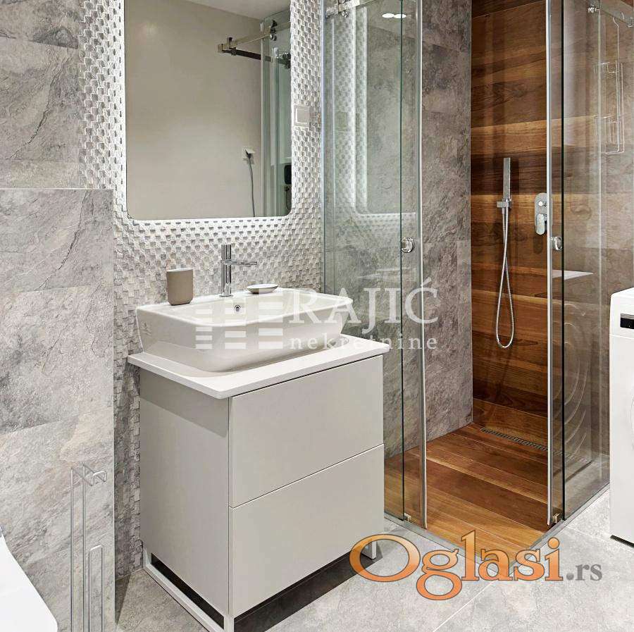 Novogradnja vrhunskog kvaliteta s porcelanskom keramikom i Bosch tehnkom. Zgrada ima portira 24 sata. Stan ima dnevni boravak sa trpezarijom, kuhinju, dve spavaće sobe, hodnik, kupatilo i terasu koja se prostire dužinom celog stana. Dva garažna mesta, doplata 200 evra. Agencijska provizija 60%.