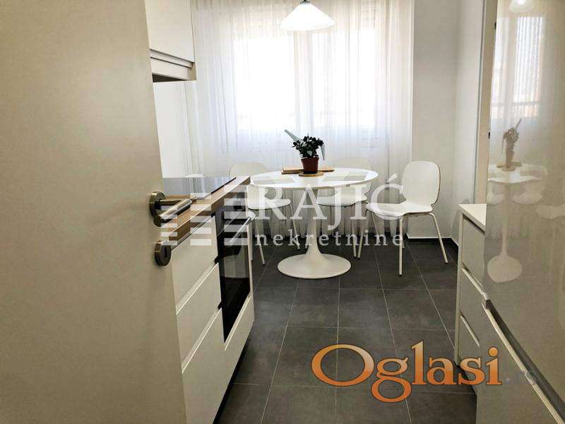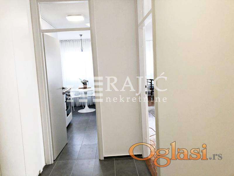 Ulazni hodnik, desno kupatilo renovirano, veće ( nova veš mašina, nov bojler Ariston, nova keramika i galanterija - sve novo), pravo spavaća soba, levo hodnik sa ugradnim plakarima duž celog zida, pravo kuhinja ( šporet, frižider, elementi - sve novo!), prostran dnevni boravak i odvojen kuhinjsko - trpezarijski deo ( nova kvalitetna garnitura, komode, sto i ostali nameštaj - sve novo).