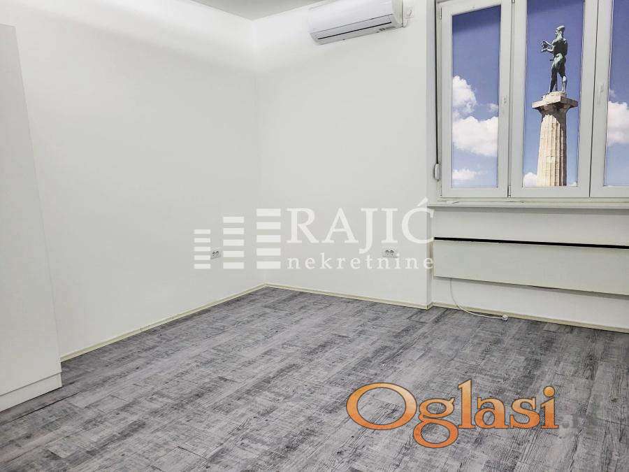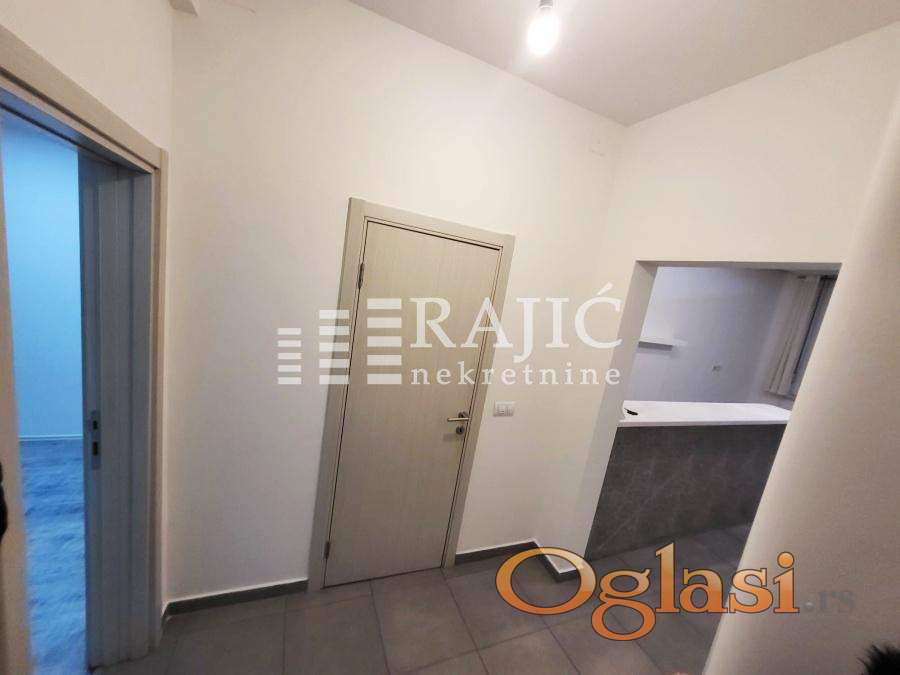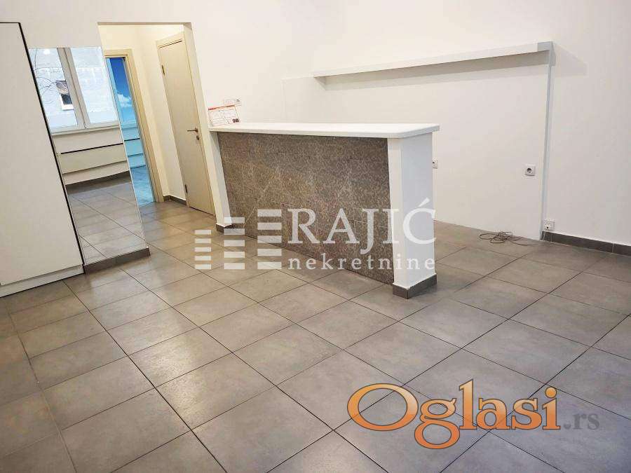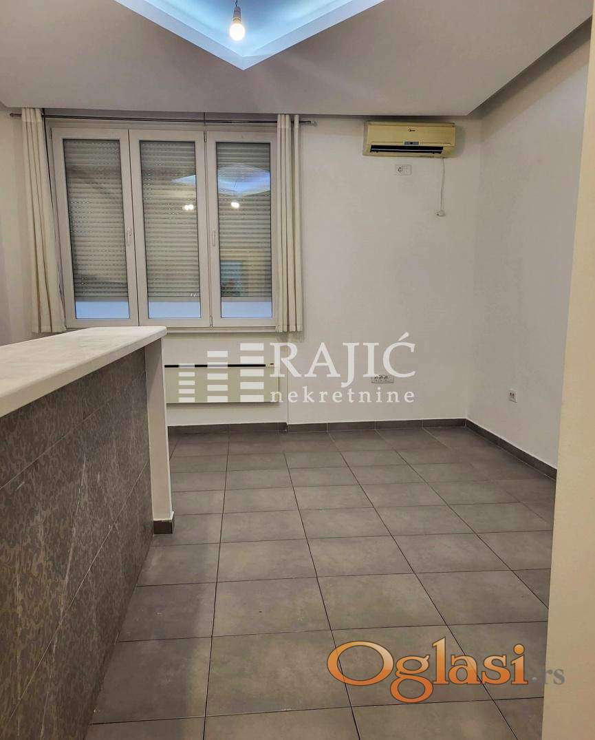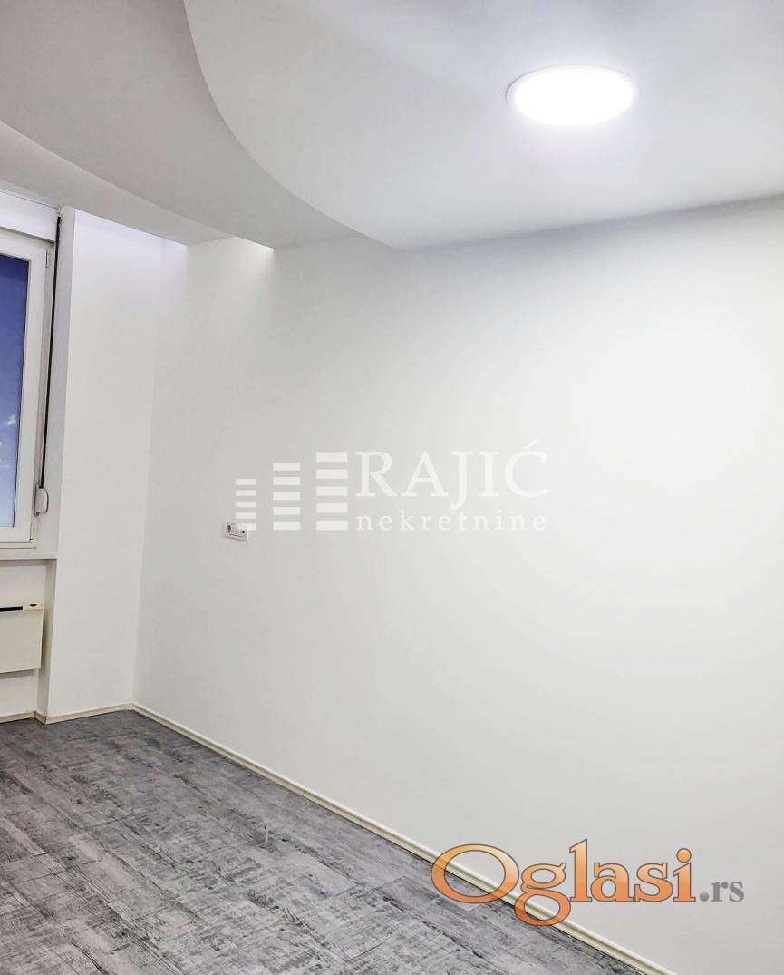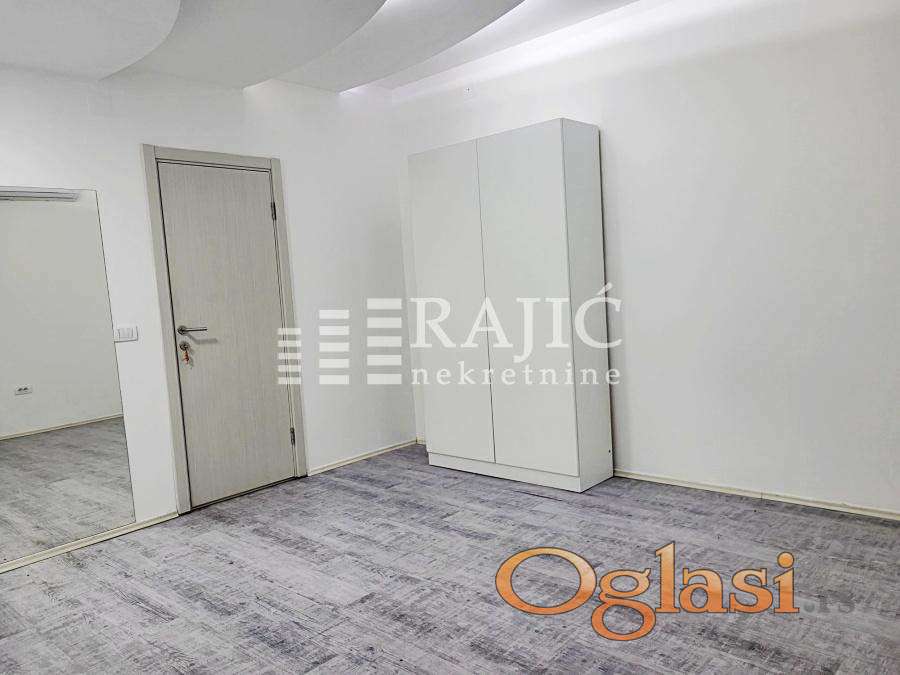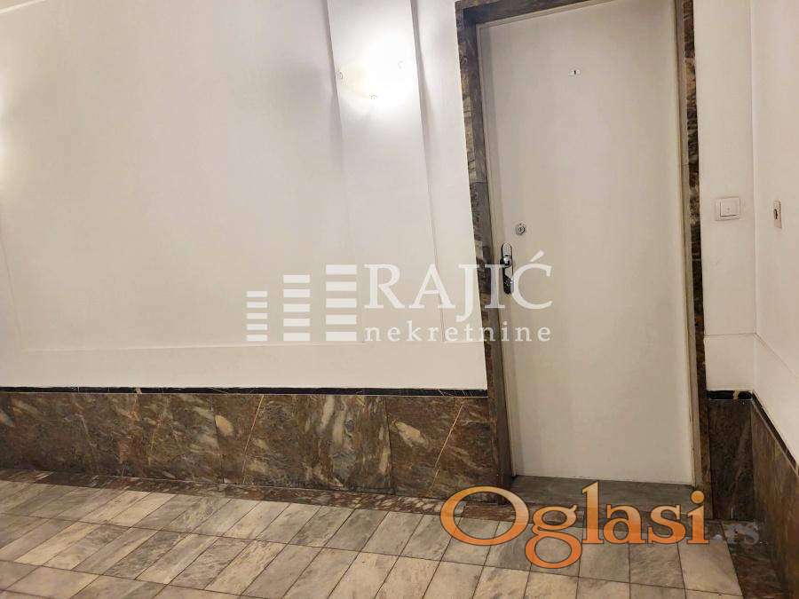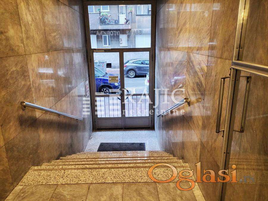 Prostorije: ulazni hodnik velika prostorija sa šankom, kupatilo (tuš,prirodna ventilacija) i druga prostorija. Stan je uredan, klimatizovan,dvostrano orijentisan, pogodan za razne vrste delatnosti. Izdaje se nenamešten, prvenstveno za poslovni prostor. Prostor je klimatizovan a grejanje na norveške radijatore,tako da tekući troškovi nisu velika stavka.
