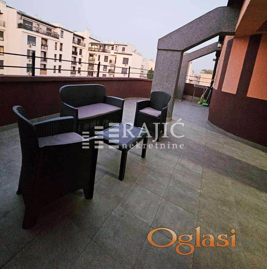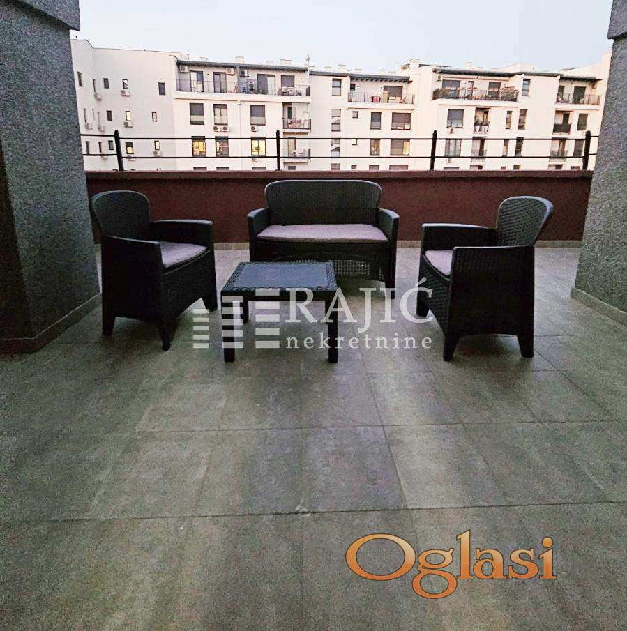 Komforan dvosoban stan sa prelepom terasom od čak 25 m2 i parking mestom u garaži. Stan ima dnevnu sobu, kuhinju sa trpezarijom, veliku spavaću sobu, dva kupatila i terasu. Inverter klima. Dozvoljeni kućni ljubimci. Agencijska provizija 60%.
