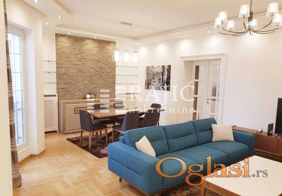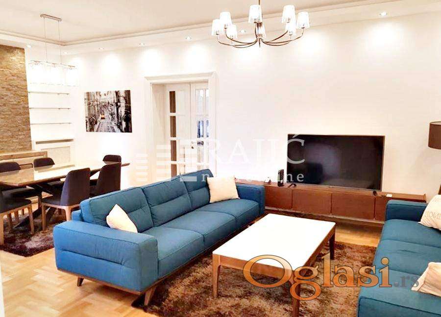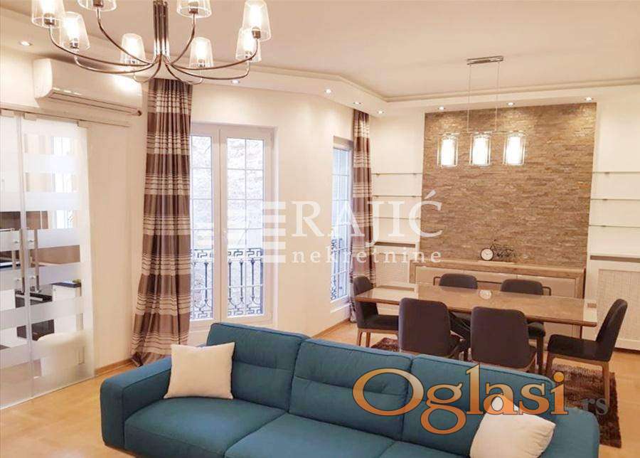 Top lokacija.Luksuzan stan, komplet opremljen luksuznim nameštajem i belom tehnikom. Izdaje se prelep,salonski stan u srcu Vračara. Ima centralni salon,kuhinju, trpezariju, dve spavaće sobe sa garderoberima, toalet, terasu na koju se izlazi iz spavaće sobe, prostoriju za pranje veša. Izuzetno komforan, svetao, luks sređen, opremljen kvalitetnom belom tehnikom. Parking mesto je moguće obezbediti u obližnjoj javnoj garaži. Agencijska provizija 50%