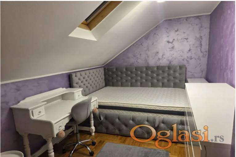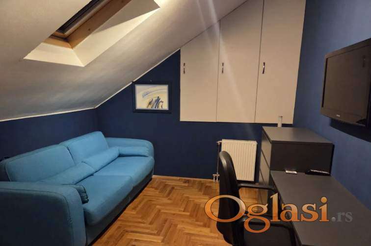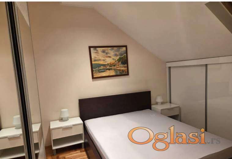 Izuzetno lep, komforan stan, kompletno opremljen idealno i za porodicu i za ljude koji rade od kuće,odlična lokacija,iz stan imate i garažu po potrebi,koja ima mogućnost za punjenje automobila na struju.Lep raspored na donjem delu su hodnik, dnevni boravak sa trpezarijom i kuhinjom, kupatilo, terasa,a na gornjem delu su hodnik,3 sobe, kupatilo,useljiv, cena 900 e+ depozit+ ag.provizija.