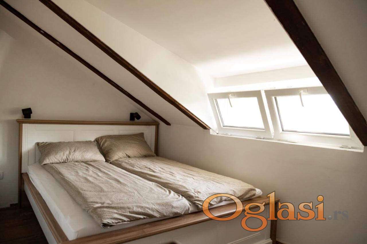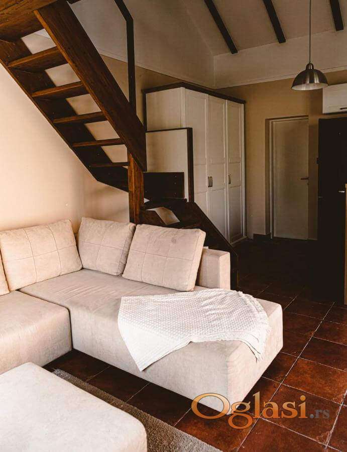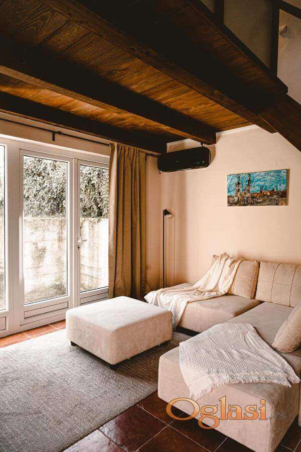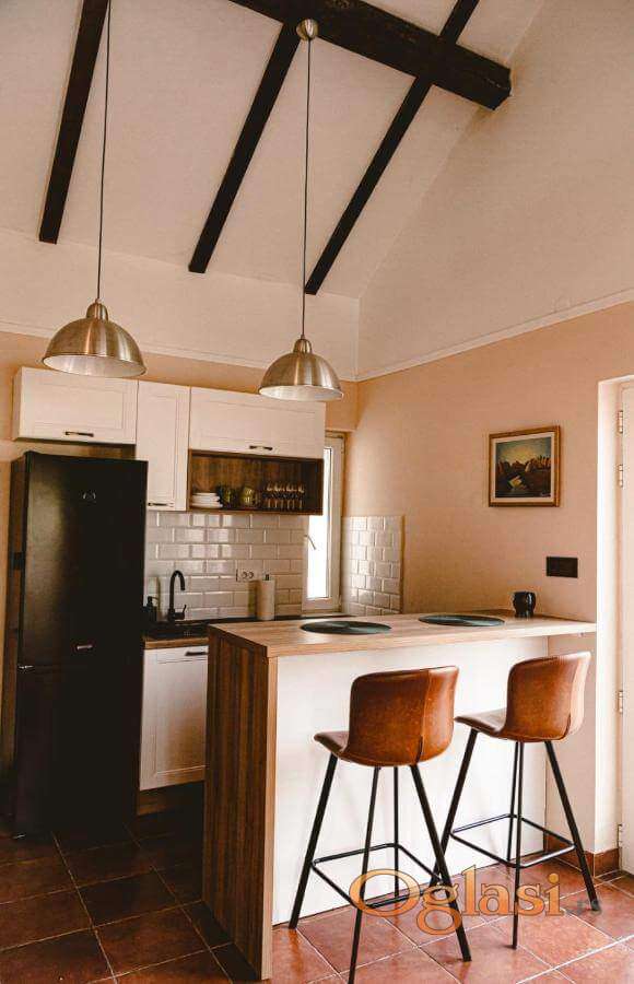 U dvorištu se nalazi kuća, potpuno renovirana i prilagođena boravku tokom cele godine. Apartman ima terasu sa pogledom na bazen, svetao dnevni boravak, opremljenu kuhinju sa frižiderom i rernom, kao i kupatilo sa tušem ili kadom. Na galeriji se nalazi bračni krevet, dok je u dnevnoj sobi ugaona garnitura pogodna za spavanje još dve odrasle osobe ili troje dece. Ukupan kapacitetjza noćenje je do -4 osobe.