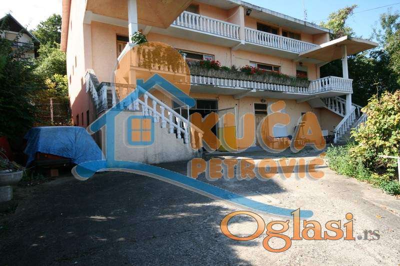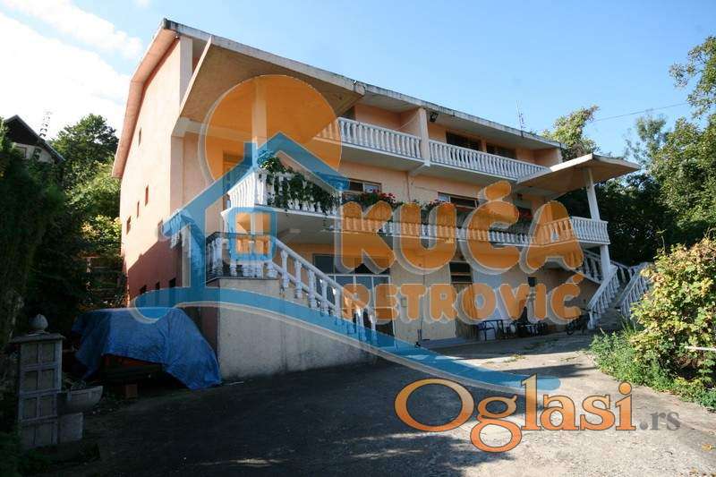 Prodaje se kuća u Niškoj Banj 450 m2 plus 50m2 atomskog skloništa, koja se nalazi u užem krugu na oko 300m od centra, na placu od 13 ari i nalazi se na samom obodu šume, fabrike kiseonika gde se nalazi voda sa izvorišta Studena jedna od tri najkvalitetnijih u Evropi. Plac je ekološki zdrav za život jer je pod nagibom, pa svaka jača kiša spere svaku nećistoću. Kuća se sastoi iz dve identične celine sa dva posebna ulaza. Na prvom spratu se nalazi ogroman dnevni boravak sa kuhinjom trpezarijom i kupatilom- Iz prostorije prvog sprata kvalitetnim stenicama se ide na potkrovlje gde se nalaze tri spavaće sobe sa kupatilom i terasom sa prelepim pogledom na Niš .Prostorije na prvom spratu i potkrovlju poseduju brodski pod i kvalitetnu drvenu stolariju. U prizemnom delu se nalazi poslovni prostor oko 150 m2 sa šankom kancelarijom i mokrim čvorom. Kuća ima dva odvojena strujomera i dva prikljućka za vodu. ispod prizemlja se nalazi atomsko sklonište sa hodnicima koji vode van kuće.