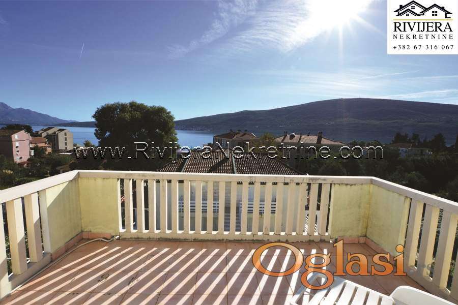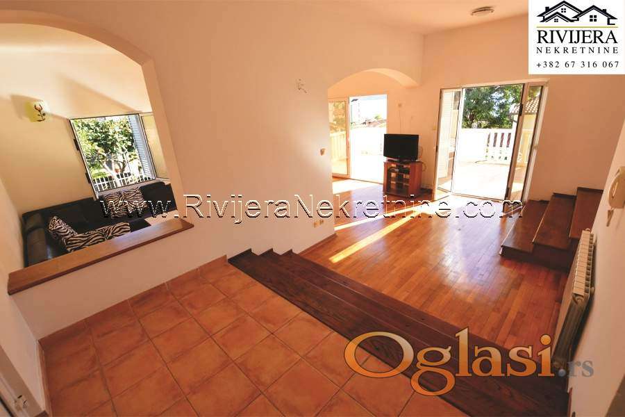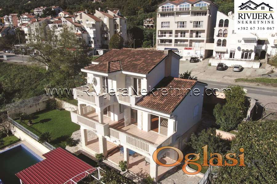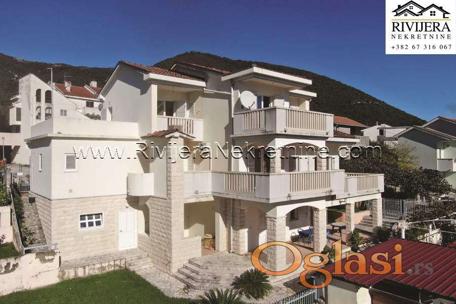 Moderna Vila u neposrednoj blizini mora Baosic. Ukupna povrsina Vile (sa terasama 350 m2) uknjizena na 296 m2. Suteren trosoban stan sa dva kupatila 92 m2 + dvorisne terase nadkrivene. Prizemlje 92 m2 + terasa (velika dnevna soba, kuhinja sa trpezarijom, toalet), prvi sprat 72 m2 + terasa (tri spavace sobe sa tri kupatila), tri terase sa pogledom na more. Garaza 20 m2, poslovni prostor 20 m2 + 20 m2 ostava. Povrsina kultivisanog , zemljista oko objekta 711 m2. Vila modern arhitekture, osuncana, sa velikim stakleni otvorima kao moru, centralno grijanje objekta. Udaljenost od mora, plaze, 200 metara, parking obezbijedjen u ogradjenom dvoristu. Lokacija atrakvitna 2.5 km od luksuznog kompleksa Portonovi Kumbor, 12 km od Herceg Novog, 15 km od aerodroma Tivat. Cijena: 860,000 eura.