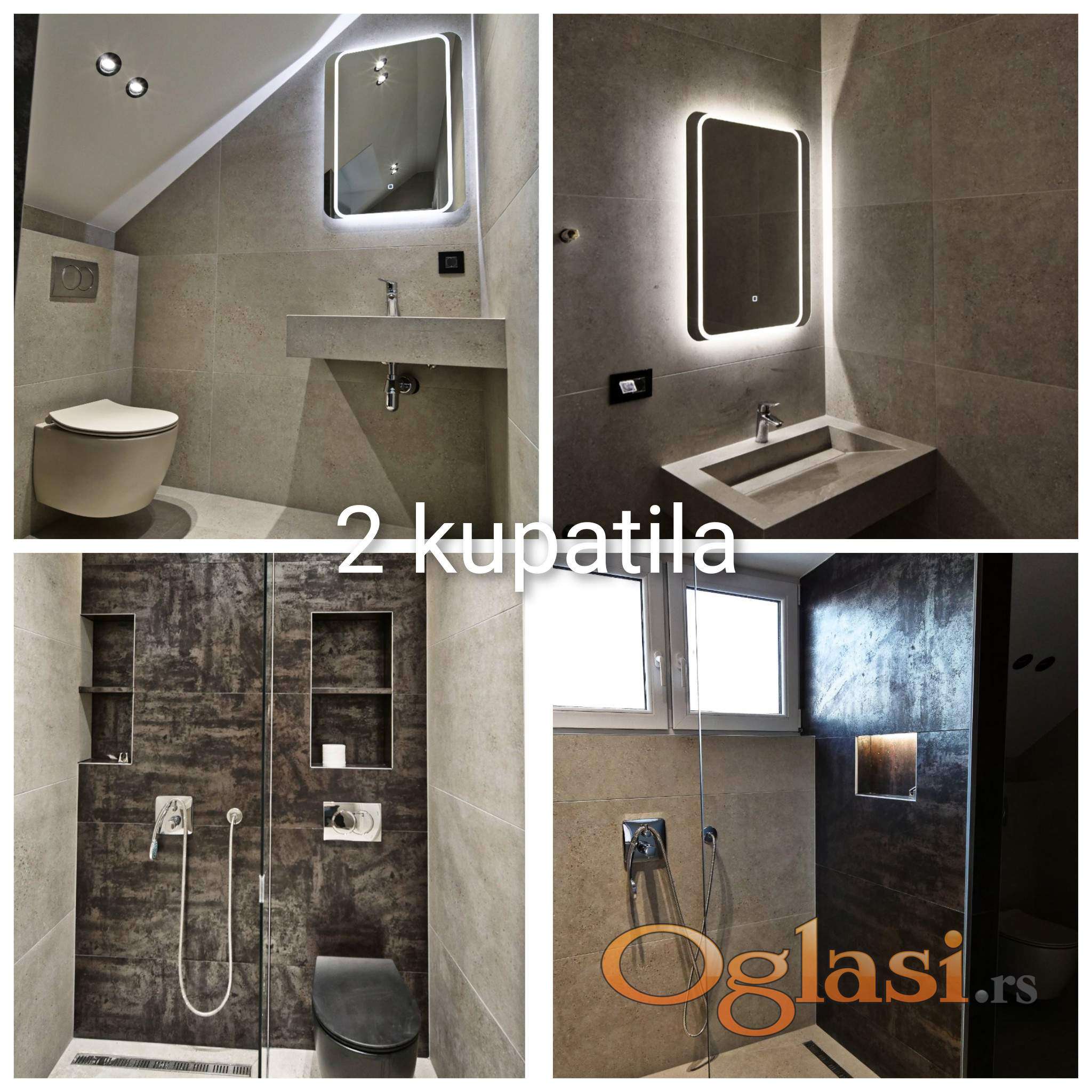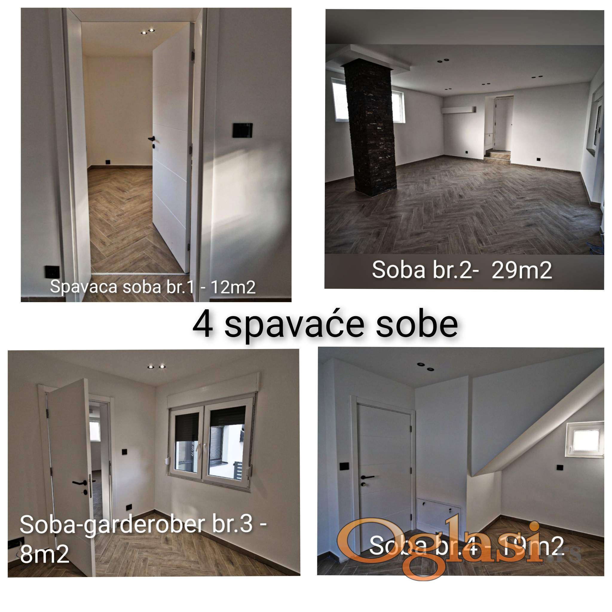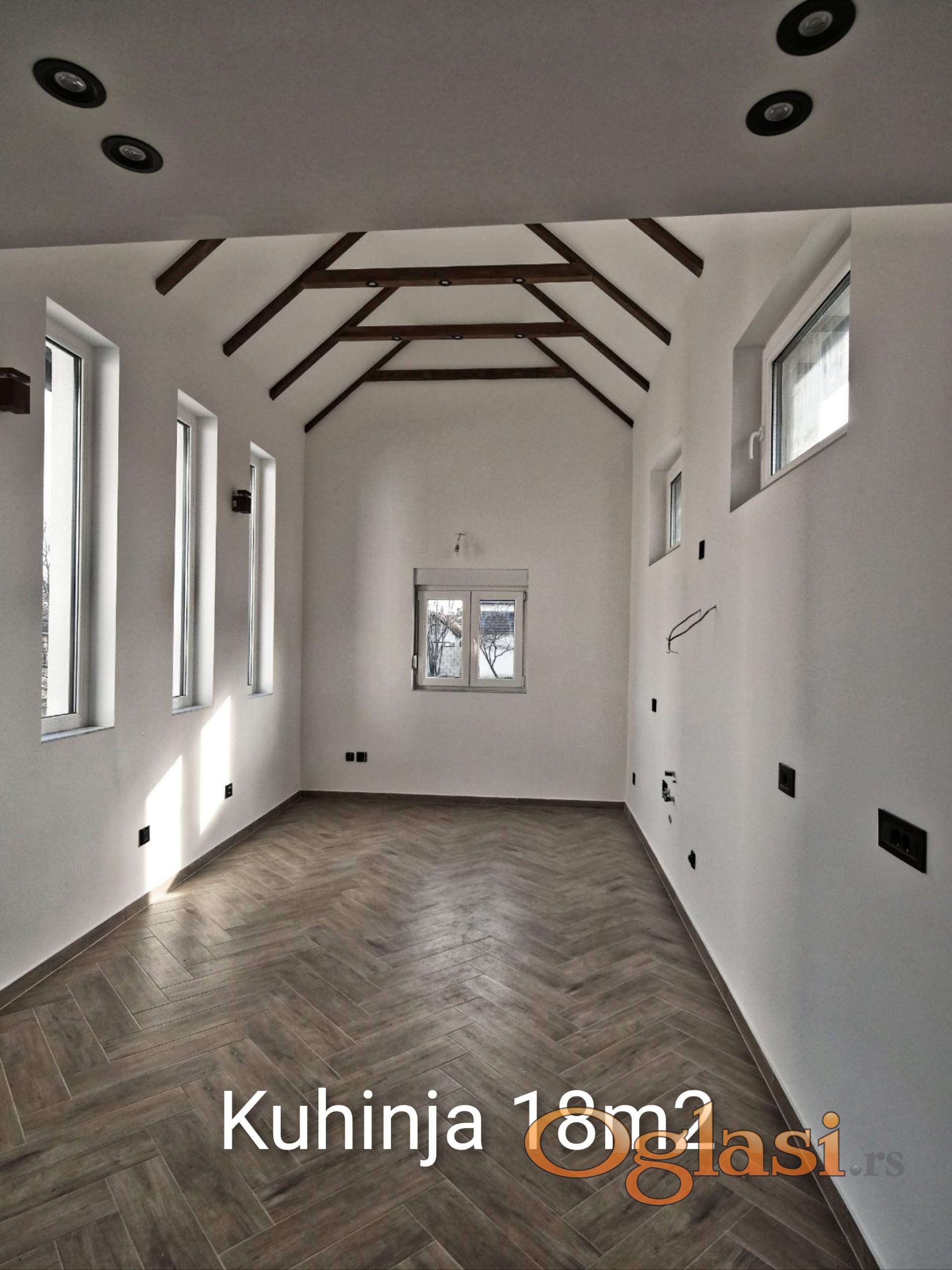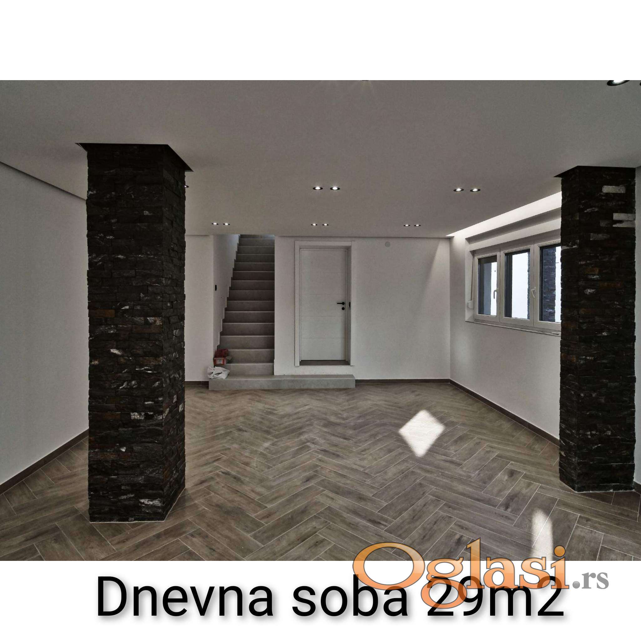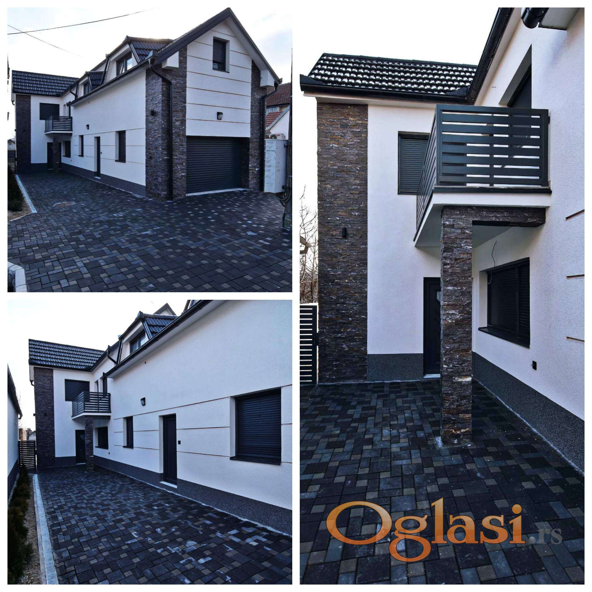 Sastoji se od dnevne sobe sa prelepo osvetljenom kuhinjom i trepzarijom,4 spavaće sobe,vešeraja, 2 kupatila,garaže..Poseduje podno grejanje na gas,4 inverter klime..