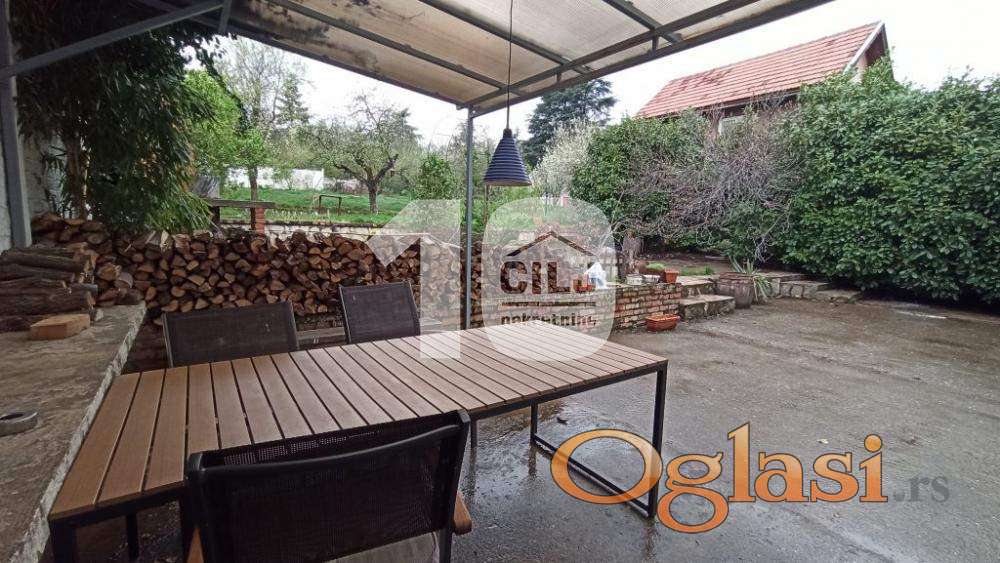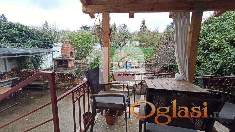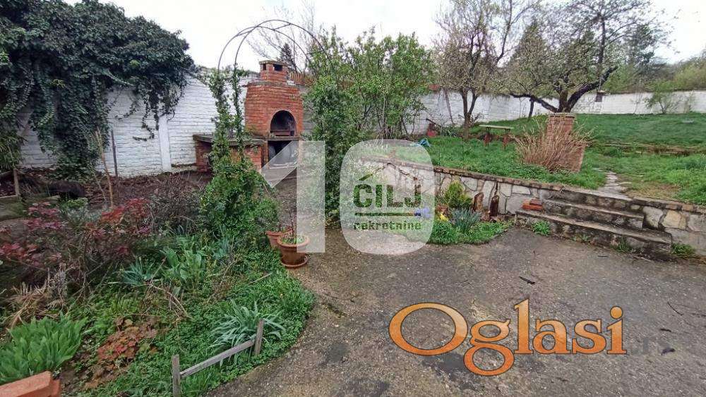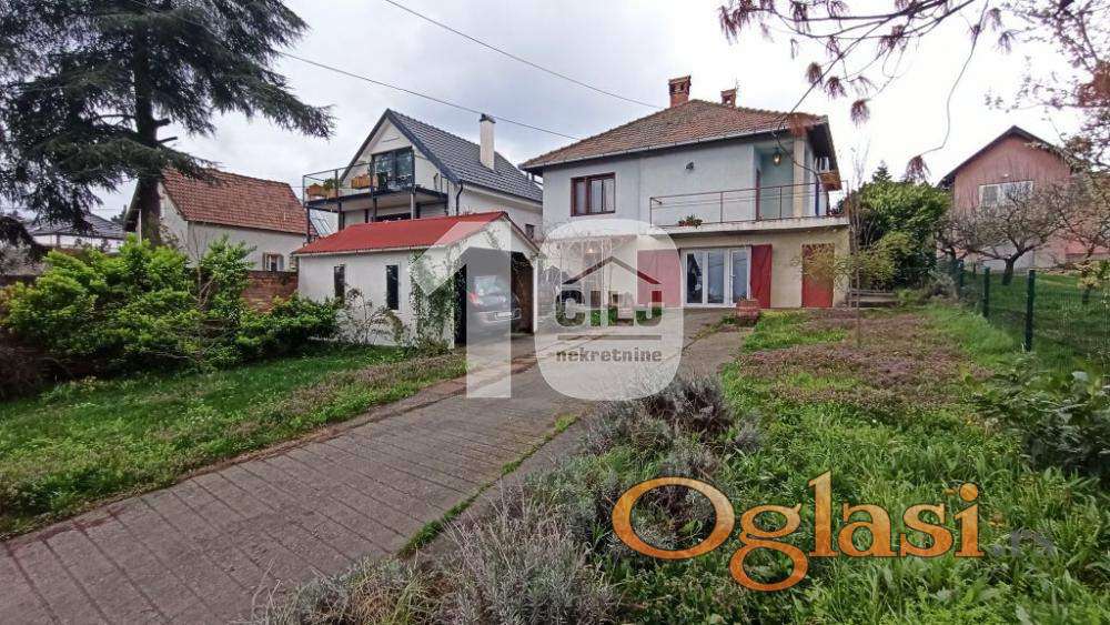 Kuća i plac u mirnom kraju, u blizini grada, dobra povezanost sa gradskim prevozom. U blizini (5 minuta vožnje) su IKEA i AVA park shoppimg centar. Sastoji se iz prizemlja i sprata (oba uslovna za život), a ploča odvaja sprat i tavan, tako da je moguće podići još jedan sprat. U skopu kuće su tri ostave za drva, alat i dr. U prizemlju se nalaze velika dnevna soba, manja soba, kotlarnica/ letnja kuhinja i wc; na spratu: trpezarija i kuhinja (odvojene pultom), spavaća soba, dnevni boravak, kupatilo (renovirano) i dve terase. Grejanje je centralno na pelet, kotao servisiran, dodatno grejanje na čvrsto gorivo i inverter klimu. Struja trofazna, gradski vodovod, internet (SBB, mogućnost za optički kabl), septička jama. Održavan plac, ograđen i podeljen na prednji i zadnji deo. U prednjem dvorištu se nalazi zasebna garaža (sprovedena struja). Zadnje dvorište na tri kaskade, zasađene voćke (dunja, kajsija, jabuka, šljiva, višnja), ukrasno drveće i cveće, leje za uzgoj povrća. Ima zidani roštilj i dvorišnu česmu. Plac ukupne površine 9,83 ara, pod zgradom 95m2, voćnjak 8,88 ara. Preporuka za miran, porodični život.