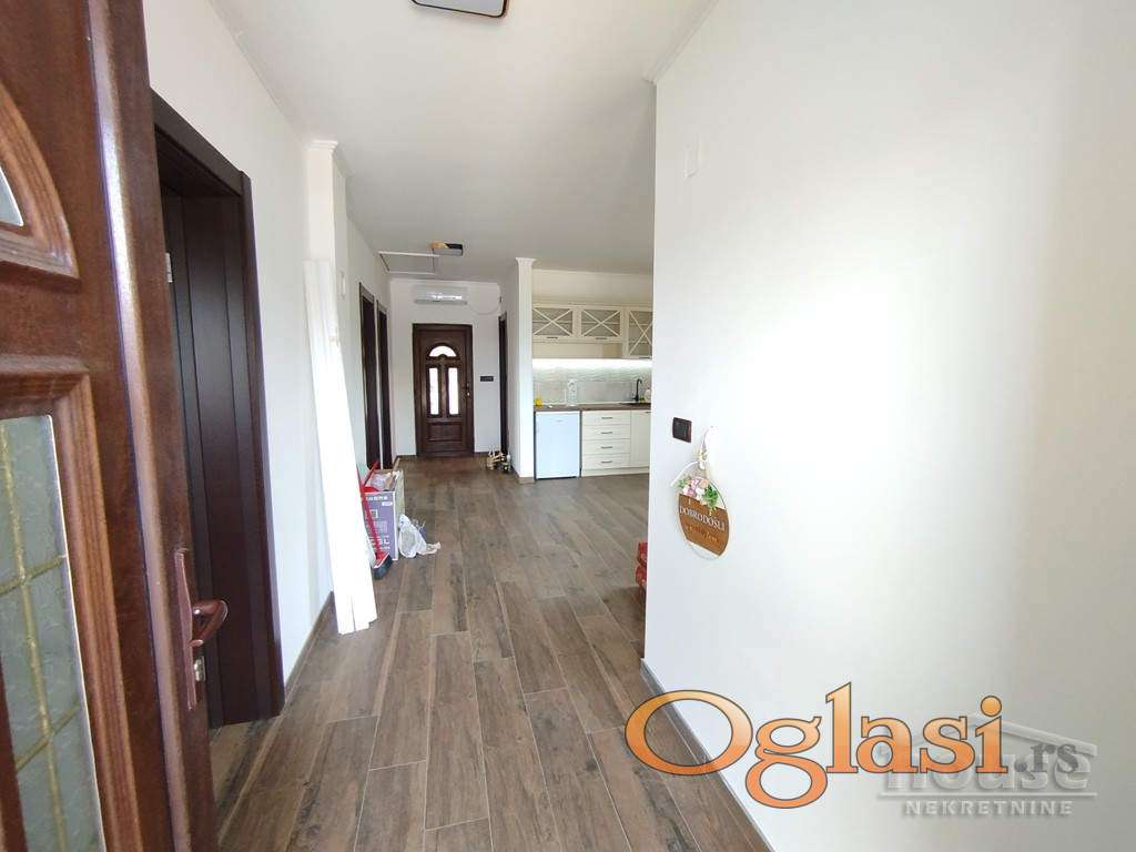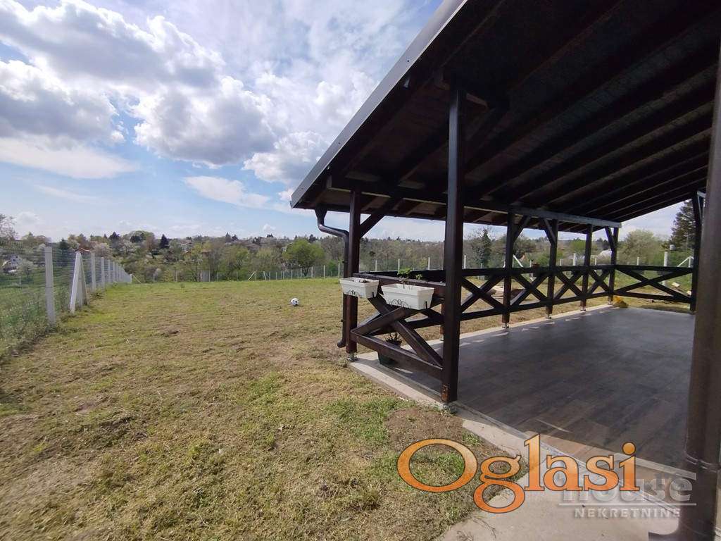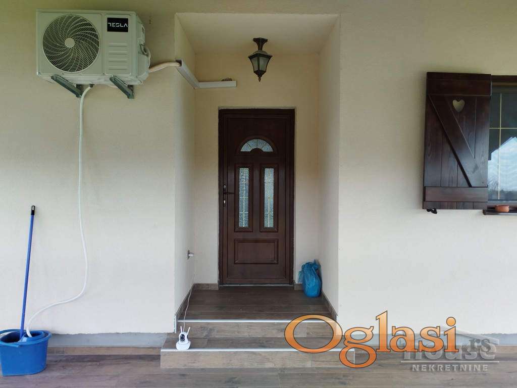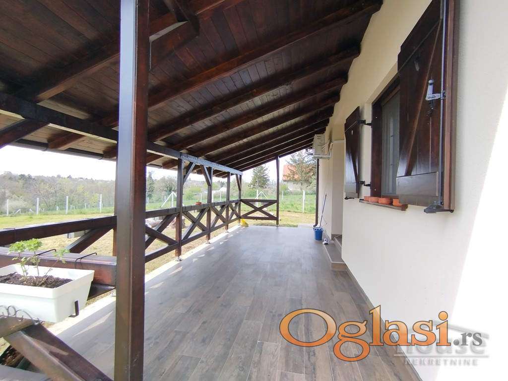 Terasa od 24 m² pruža predivan pogled – idealno mesto za jutarnju kafu ili večernji zalazak sunca.Kuća je rađena izuzetno pažljivo, sa kompletnim planovima za vodu i struju. Ugrađeni su Bosch radijatori, inverterska klima, pvc stolarija i ručno rađene drvene žaluzine (šalukatre). Osvetljenje je moderno, sa plafonjerama koje imaju podešavanje svetla na daljinski.Dodatne pogodnosti su puno praktičnih detalja -kapija na daljinsko upravljanje, betonirana staza do kuće i asfaltni prilaz, česma u dvorištu, razvučeni kablovi za interfon i kamere.