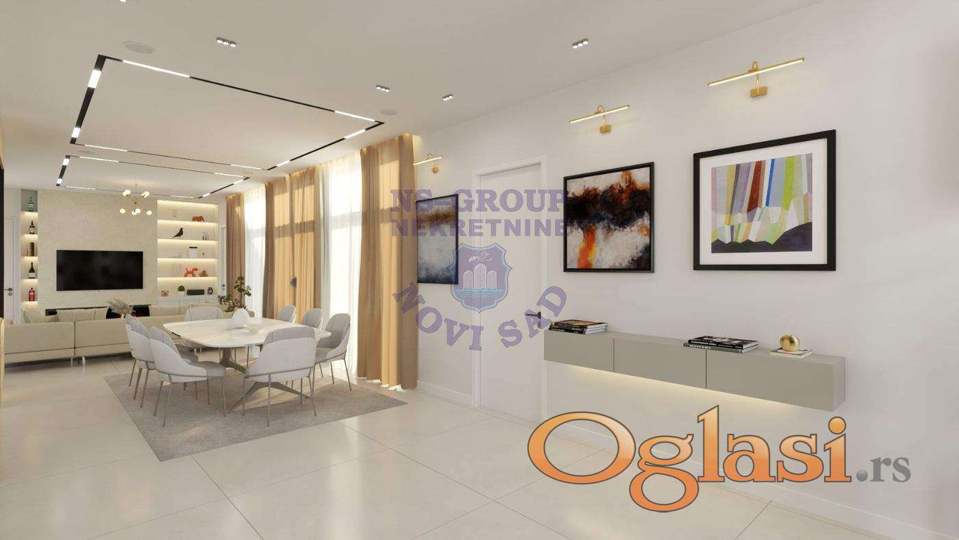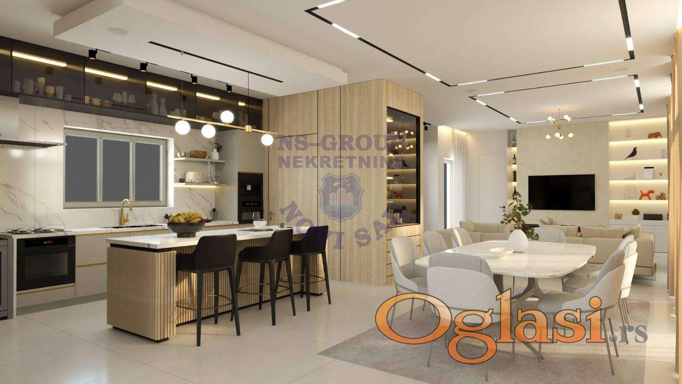 Kuća sa ograđenim dvorištem se nalazi u Rakovcu, do kuće se dolazi glavnom ulicom i novim asfaltiranim putem direktno do kuće. Od centra Novog Sada se stiže za 15min. Sa prostrane terase ispred kuće je pogled na zelenilo susednog brda i Novi Sad. Lokacija je idealna jer se nalazi u tihom delu Rakovca gde se nalazi dosta zelenila. U neposrednoj blizini se nalaze osnovna škola, marketi, pošta i apoteka. Parcela se prostire na 1500 m2 i kompletno je uređena. U prednjem delu se nalazi kuća od 350 m2 (kuća sa garažom u suterenu se prostire na 200 m2, a terasa je 150 m2). Preostali deo parcele poseduje dvorište sa zelenilom kao i koridor ispred kuće sa 4 pozicije za parkiranje automobila. Dvorište sa zelenilom je potpuno automatizovano sa zalivnim sistemom što će omogućiti da rastinje na dvorištu uvek bude bujno.Kuća poseduje dnevnu sobu, kuhinju, ostavu, trpezariju, lobi, 3 spavaće sobe, 2 kupatila, 1 toalet i 1 tehničku prostoriju. U suterenu kuće se nalazi zatvorena garaža za 2 vozila. Oko kuće se nalaze prostrane terase, prednji prilaz kući poseduje velike žardinjere sa zelenilom i cvećem sa automatskim sistemom za navodnjavanje i rasvetu. Ispred ulaza se nalazi i jedno parking mesto sa instalacijama za električni punjač za punjenje električnih vozila. U zadnjem delu dvorišta se nalazi pozicija sa instalacijom, strujom, vodom i kanalizacijom za đakuzi kao i tuševi. Staklene moderne ograde sa transparentnim staklom su postavljene oko prednje terase. Opis dvorišta: Poravnato dvorište se prostire na 650 m2 u dve zone.Jedna je viša, koja ima pogled na grad i mogućnost za gradnju bazena i dodatnog pomoćnog objekta. Dok je donji deo dvorišta idealan za postavku dečijeg igrališta ili staklene bašte. d24
