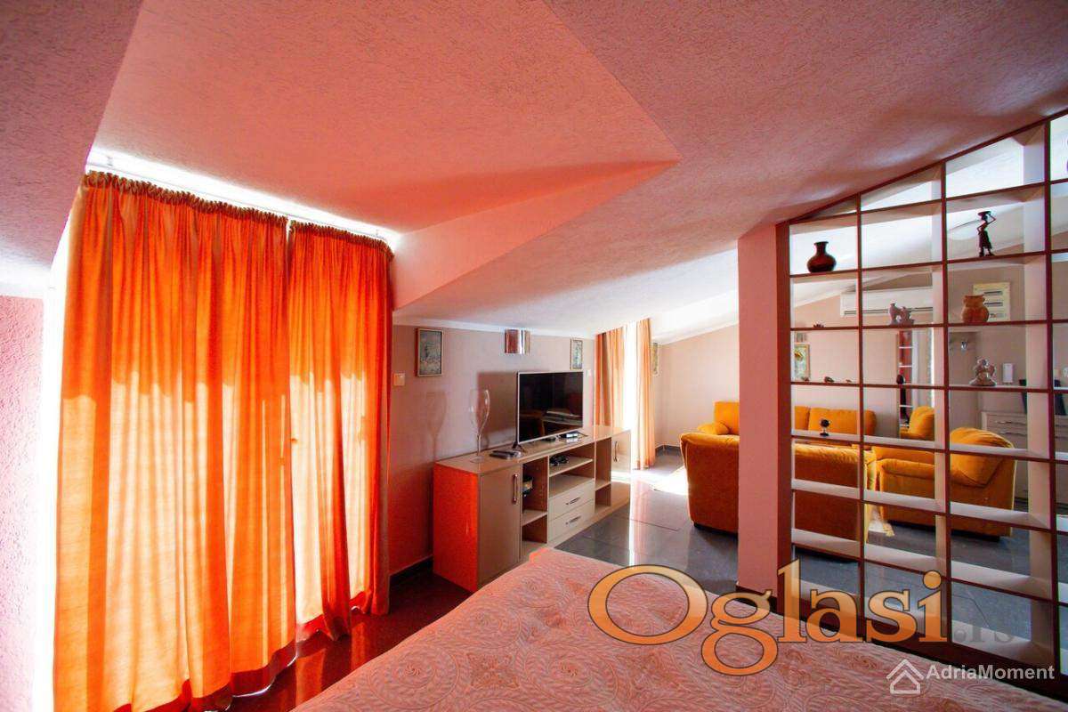 Drugi sprat: veliki stan od 100 m2. Raspored: dnevni boravak s kuhinjom, 2 spavaće sobe, 2 kupaonice, garderoba i terasa.