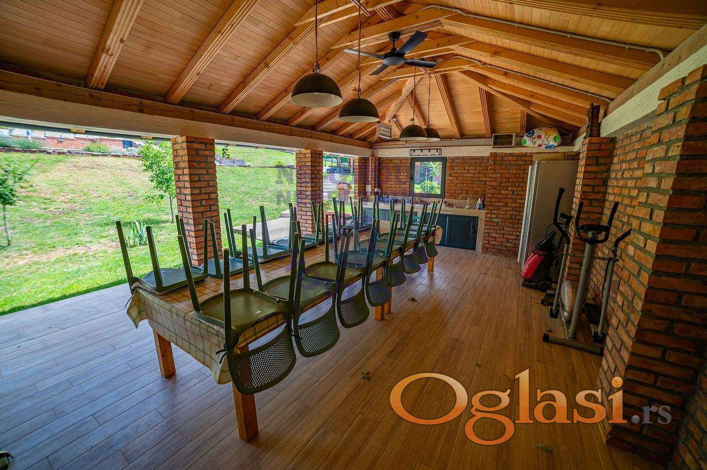 Ova luksuzna kuća na Popovici nudi savršen spoj komfora i elegancije, idealna je za one koji traže mir i privatnost, a istovremeno žele biti blizu grada. Smeštena na prostranom imanju, kuća se ističe modernim dizajnom i pažljivo odabranim detaljima. Unutrašnjost je prostrana i svetla, sa velikim staklenim površinama koje omogućavaju neometan pogled na grad. Svaka soba je opremljena najkvalitetnijim materijalima i luksuznim nameštajem, pružajući osećaj raskoši i udobnosti. Eksterijer kuće je jednako impresivan. Veliki bazen poziva na opuštanje i uživanje tokom toplih dana, dok je savremeno opremljena letnja kuhinja sa roštiljem savršena za druženja i pripremu obroka na otvorenom. Pomoćni objekti, kao što su gostinska kuća i prostor za rekreaciju, pružaju dodatnu udobnost i funkcionalnost. Uz sve to, kuća nudi spektakularan pogled na grad, koji se posebno ističe u večernjim satima kada svetla grada stvaraju magičnu atmosferu. Ova nekretnina na Popovici je pravo utočište za one koji traže luksuz, privatnost i blizinu svih gradskih sadržaja.