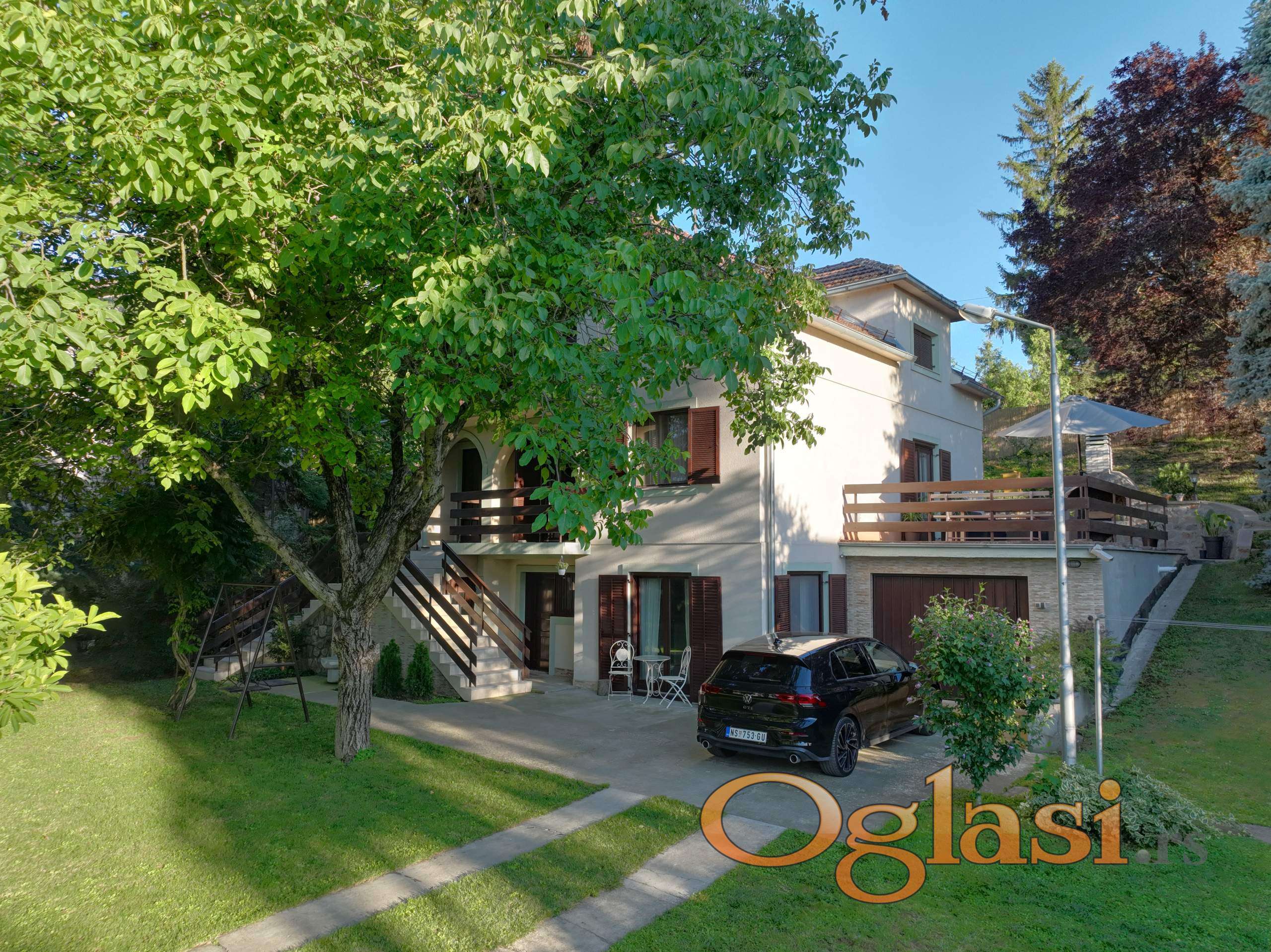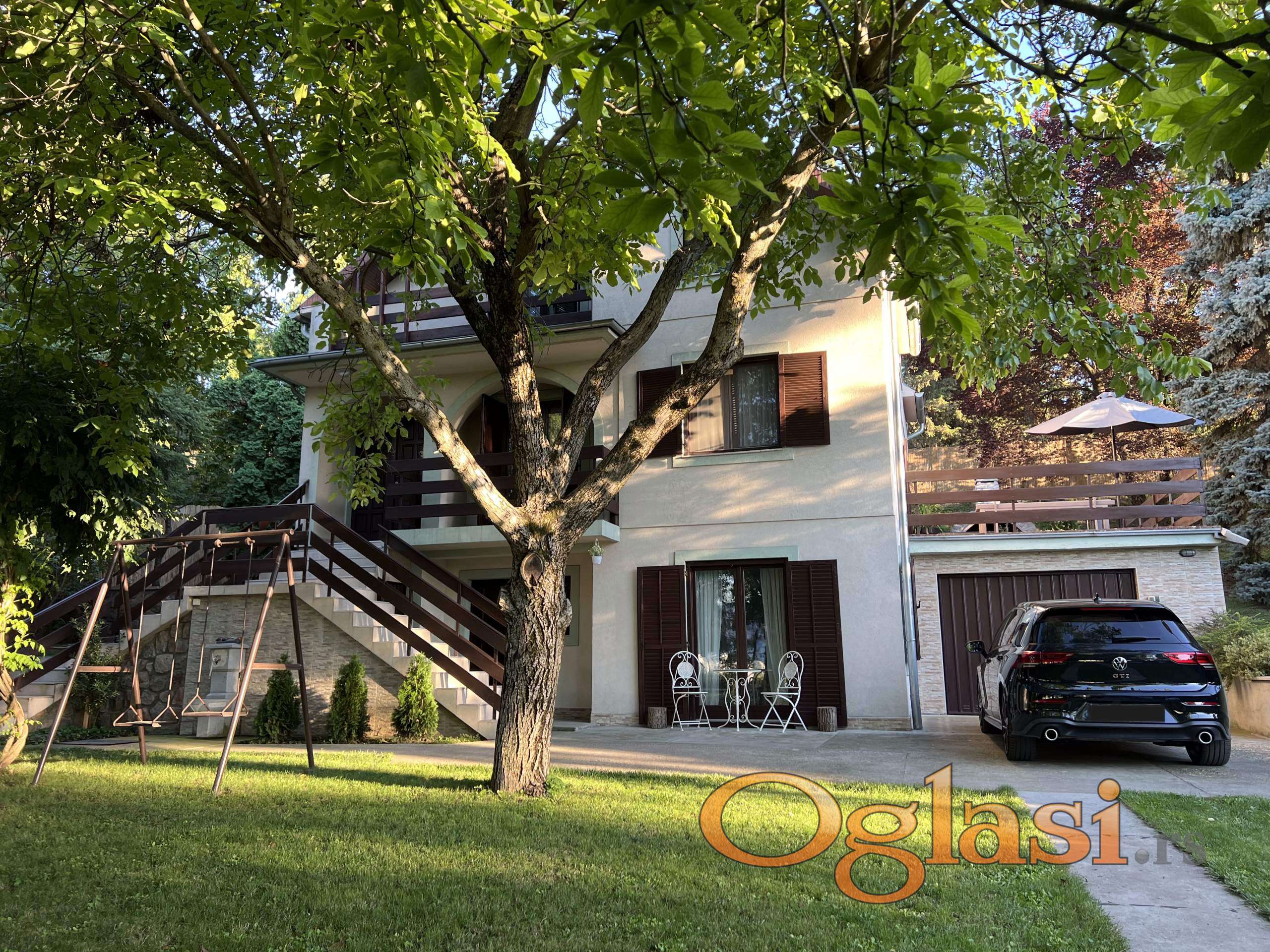 Kuća se sastoji od tri sprata: suteren, prizemlje i visoko potkrovlje. Dve kuhinje (velika u prizemlju, manja u suterenu), dva kupatila i toalet sa vešerajem, četiri spavaće sobe (jedna spavaća soba spojena sa garderoberom). Velika terasa sa zidanim roštiljem, povezana sa kuhinjom. Garaža (26 m2) sa kotlarnicom i 5 parking mesta u dvorištu.