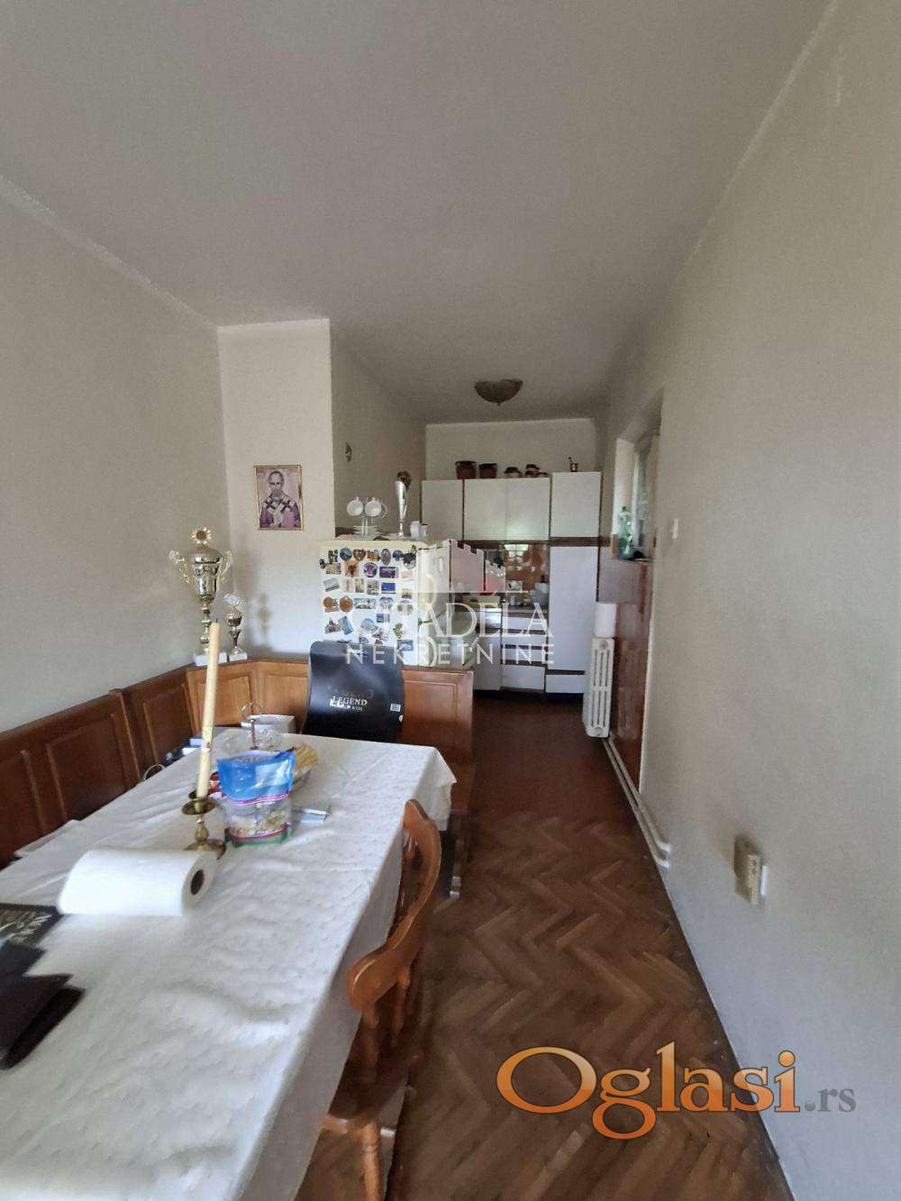 PROSTORIJE: dnevni boravak, 2 spavaće sobe, kuhinja, trpezarija, kupatilo, veranda, pomoćni objekat, garaža