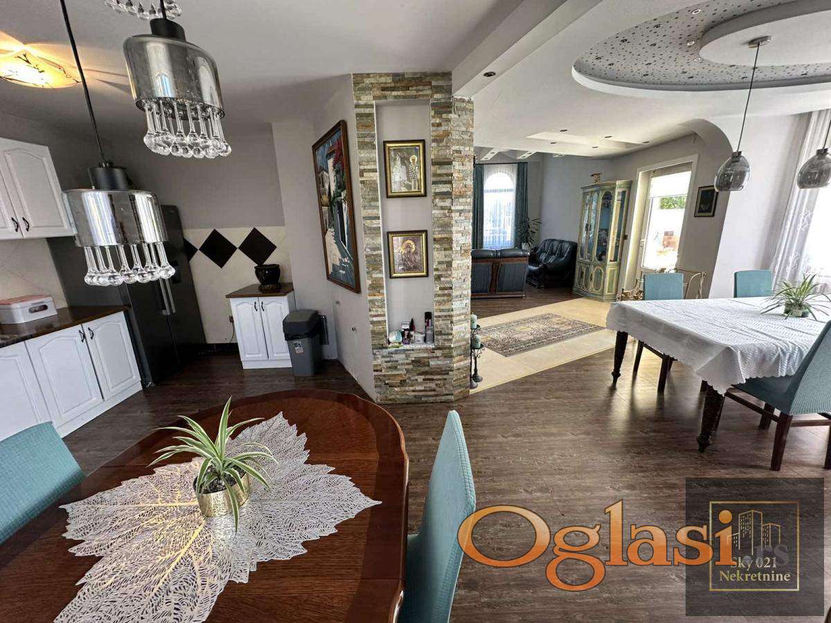 Kuća se sastoji od prostrane dnevne sobe povezane sa trpezarijom i kuhinjom, četiri komforne spavaće sobe i tri kupatila. U sklopu objekta nalaze se i dve garaže, dok je dvorište posebno uređeno i oplemenjeno bazenom i đakuzijem, pružajući potpuni komfor i luksuz.