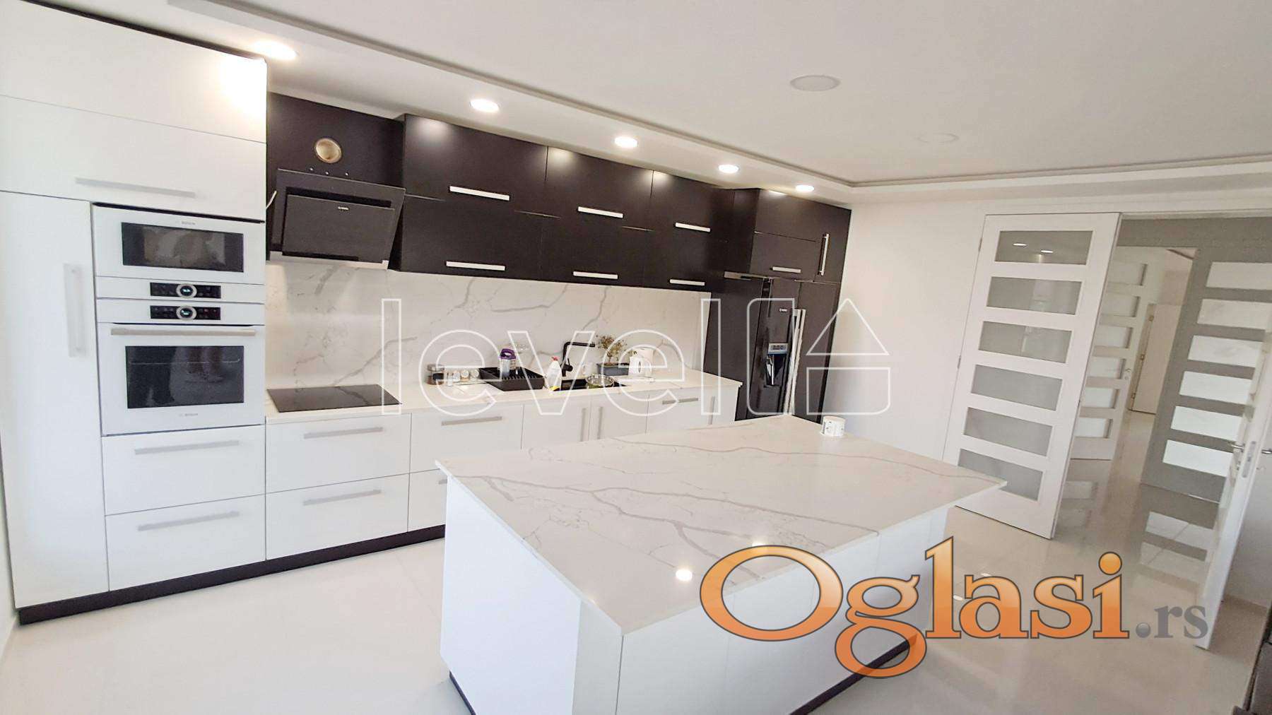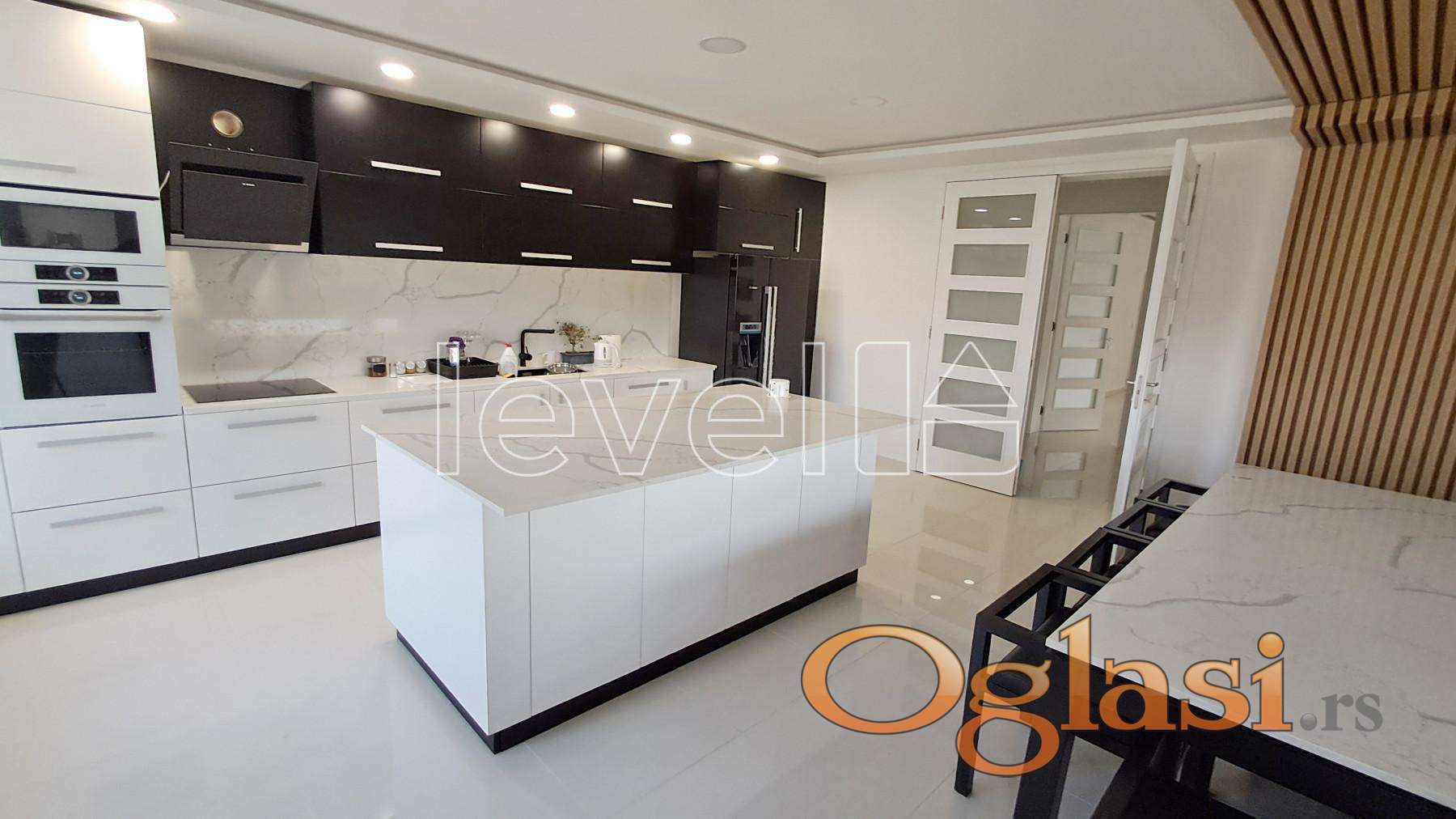 Na prodaju ekskluzivna novoizgrađena kuća na Popovici u Sremskoj Kamenici, idealna za one koji traže spoj luksuza, mira i blizine grada – smeštena svega 15-tak minuta vožnje od Novog Sada, uvučena od glavnog puta i izolovana od buke, pruža potpunu privatnost i prelep panoramski pogled na Dunav, Novi Sad i Frušku goru. Kuća je moderno projektovana sa obiljem prirodne svetlosti zahvaljujući velikim staklenim površinama i brojnim terasama, a građena je vrhunskim materijalima i opremljena najkvalitetnijom opremom. Na placu od 718 m² nalazi se stambeni objekat neto površine 591 m² (ukupna građevinska površina 859 m²), raspoređen na tri etaže. U suterenu se nalaze dve odvojene sobe, garaža sa grejanim prilazom, hobi soba i kupatilo, dok se na visokom prizemlju ističu moderno uređena kuhinja sa trpezarijom, prostrani dnevni boravak sa izlazom na zastakljenu terasu, vešeraj, toalet i predsoblje sa ugradnim plakarima. Sprat kuće čine četiri spavaće sobe (jedna sa sopstvenim kupatilom), od kojih svaka ima izlaz na terasu, dodatno kupatilo i toalet, a ekskluzivnosti prostora doprinosi i svetlarnik na krovu površine oko 30 m², koji je zamišljen kao zona za relaksaciju. Enterijer odiše elegancijom kroz mermerne podove i podno grejanje na gas ili termalnu pumpu, dok je eksterijer upotpunjen bazenom sa slanom vodom, odvojenim đakuzijem i pažljivo uređenim dvorištem. Ukoliko tražite dom koji pruža udobnost, privatnost, vrhunsku estetiku i funkcionalnost u neposrednoj blizini grada, ova nekretnina predstavlja savršen izbor. Za dodatne informacije pozovite...