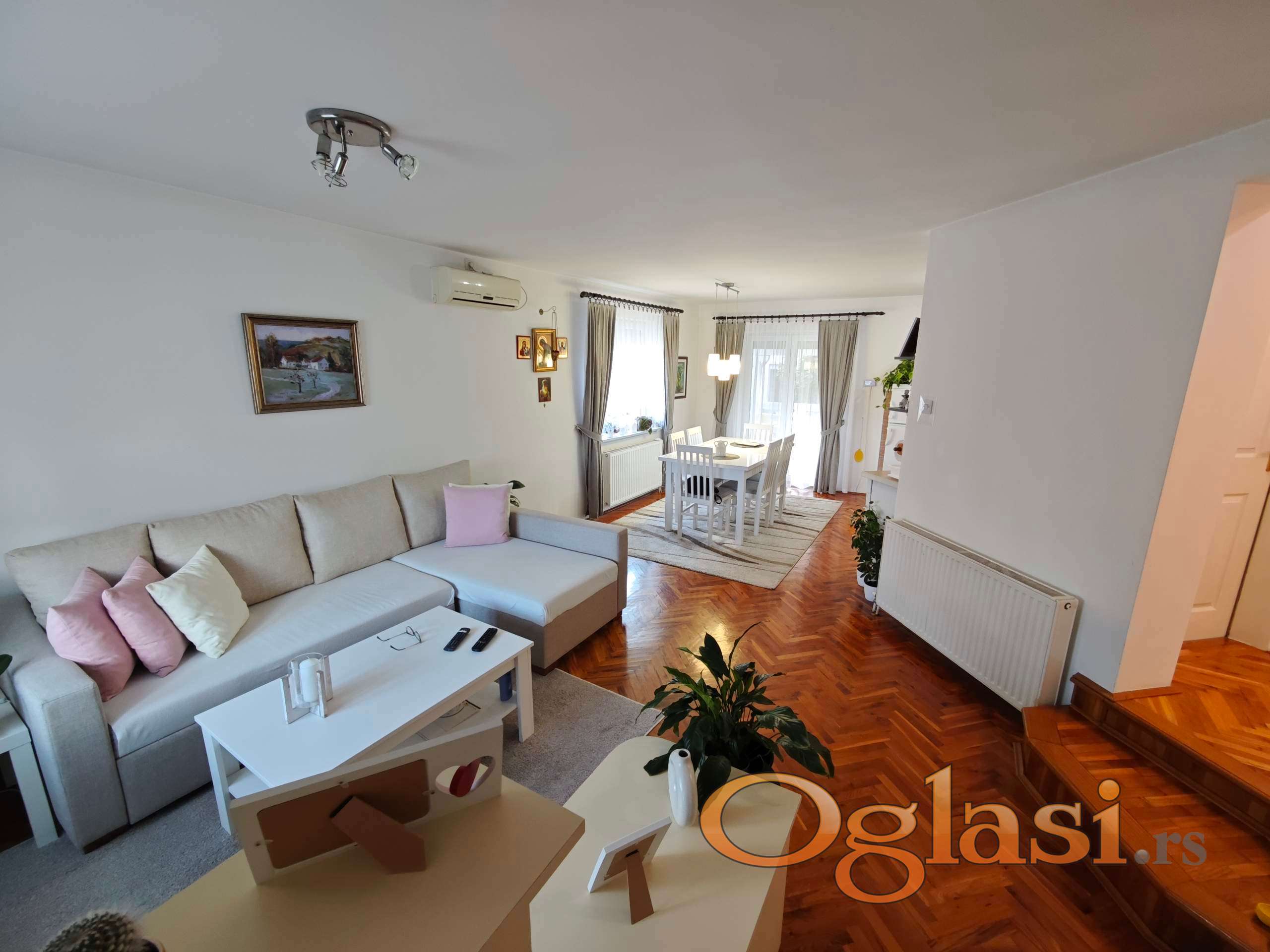 Kuća poseduje centralno grejanje na čvrsto gorivo i gas, PVC stolariju, izolaciju, klima uređaj, parket u dnevnoj zoni i laminat u spavaćim sobama.
