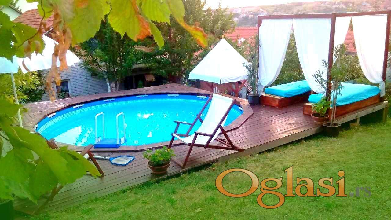 Kuća je osnove 83m2 sa ukupno 270m2 stambenog prostora. Prizemni deo kuće se sastoji od pretsoblja, kupatila, velikog dn.boravka, sp.sobe, velike kuhinje sa trpezarijom i izlazom na terasu, stepenište za sprat i garaža (radionica).