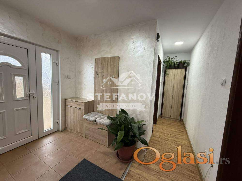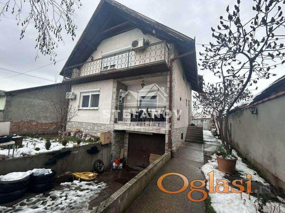 Na prodaju kuća sa potkrovljem i suterenom površine 160 m2 na placu od 7,5 ari. Nalazi se na uličnom delu parcele i poseduje kolski ulaz. Suteren se sastoji od garaže, kotlarnice i vešeraja. U prizemlju veliki dnevni boravak sa trpezarijom, odvojenom kuhinjom i izlazom na terasu, hodnika, spavaće sobe, kupatila i toaleta. Potkrovlje čine, dve spavaće sobe, radna soba i kupatilo. Građena od čvrstog materijala sa betonskim pločama, stolarija PVC sa roletnama, CG na GAS, kanalizacija, trofazna struja, podovi, tarket, laminat i keramika. Dvorište ograđeno i čini ga stan od 45 m2, novije gradnje, koji se sastoji od hodnika, sobe, kuhinje i kupatila. Kupatilo u potkrovlju komletno renovirano, urađena demit fasada do komšije. U dvorištu još dve šupe. Kuća se nalazi nedaleko od centra naseljenog mesta, u mirnoj ulici i lepo uređenim dvorište koje pruža priovatnost. Blizina škole, vrtića marketa, doma zdravlja, javnog prevoza...Uknjižena 1/1