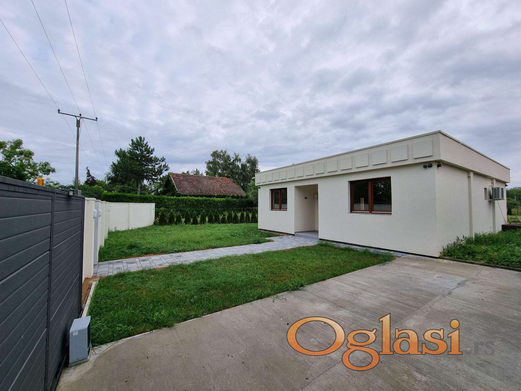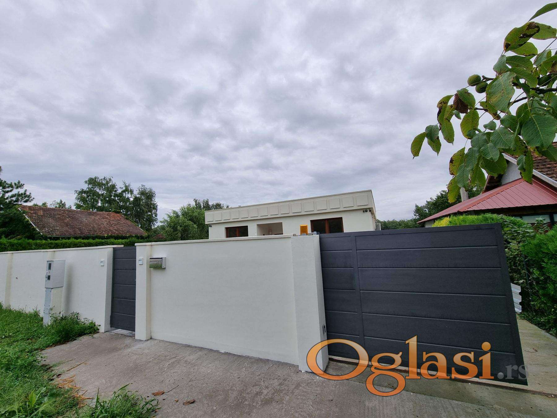 Ograda - sa prednje, ulazne strane nalazi se moderna zidana, betonska ograda. Moderna ulazna kapija, garažno mesto za 1 auto i klizna, automatska kapija (otvaranje na daljinski). Ostatak placa oivičen je zelenom zimzelenom ogradom - smaragd tujama.