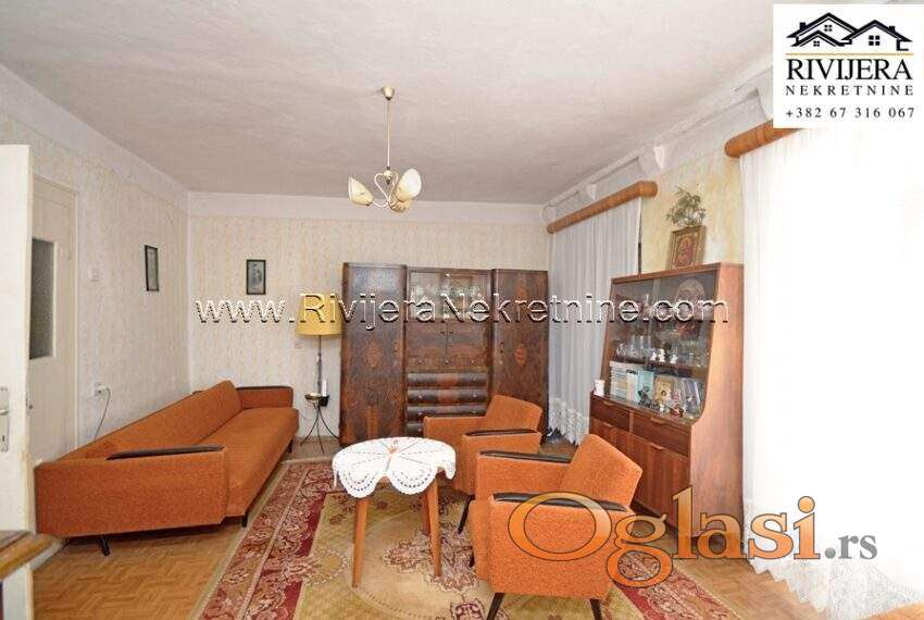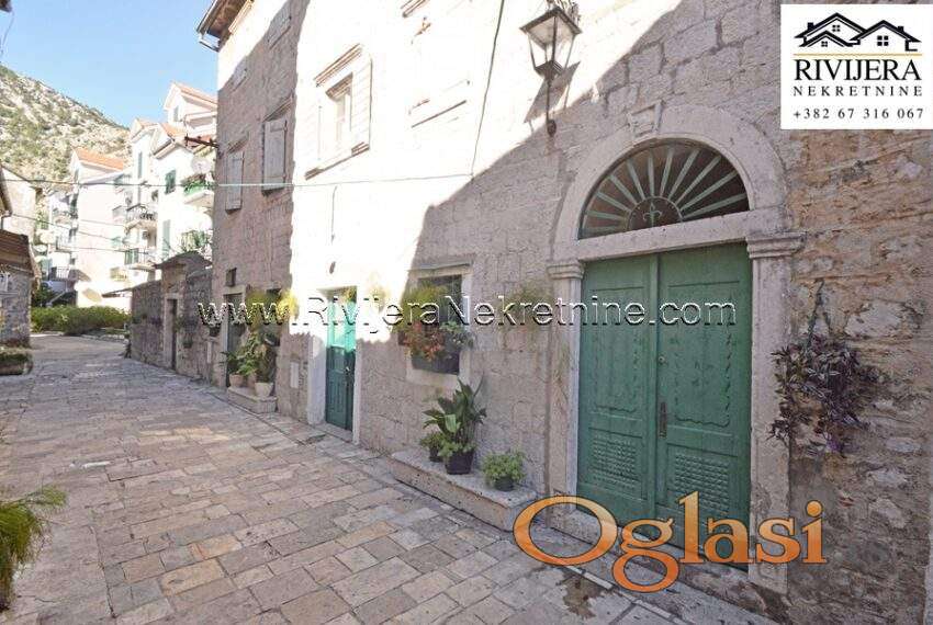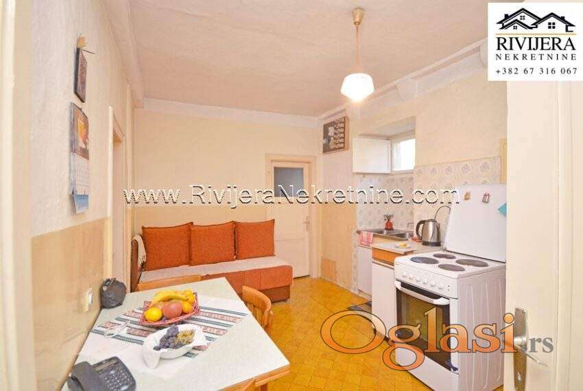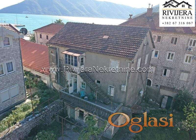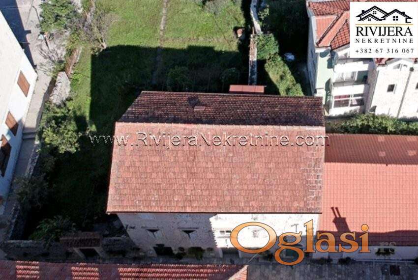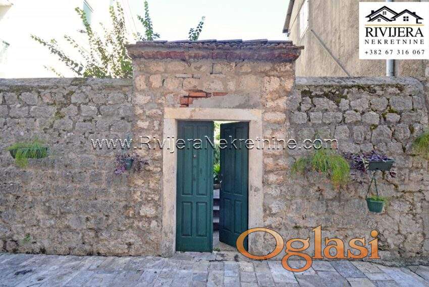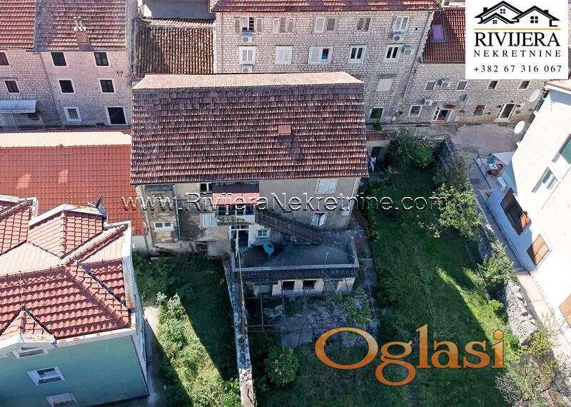 Stara kamena kuca Risan. Kuca ukupne povrsine 350 m2 sa pomocnim objektom. Kuca se sastoji od 2 dvosobna stana i 2 poslovna prostora. U potkrovlju je mansandra povrsine 42 m2. Kuca je stara preko 150 godina u dobrom stanju i potrebno je unutrasnje renoviranje. Uz kucu je plac ukupne povrsine 750 m2. Mogucnost gradnje stambenog objekta na placu.
