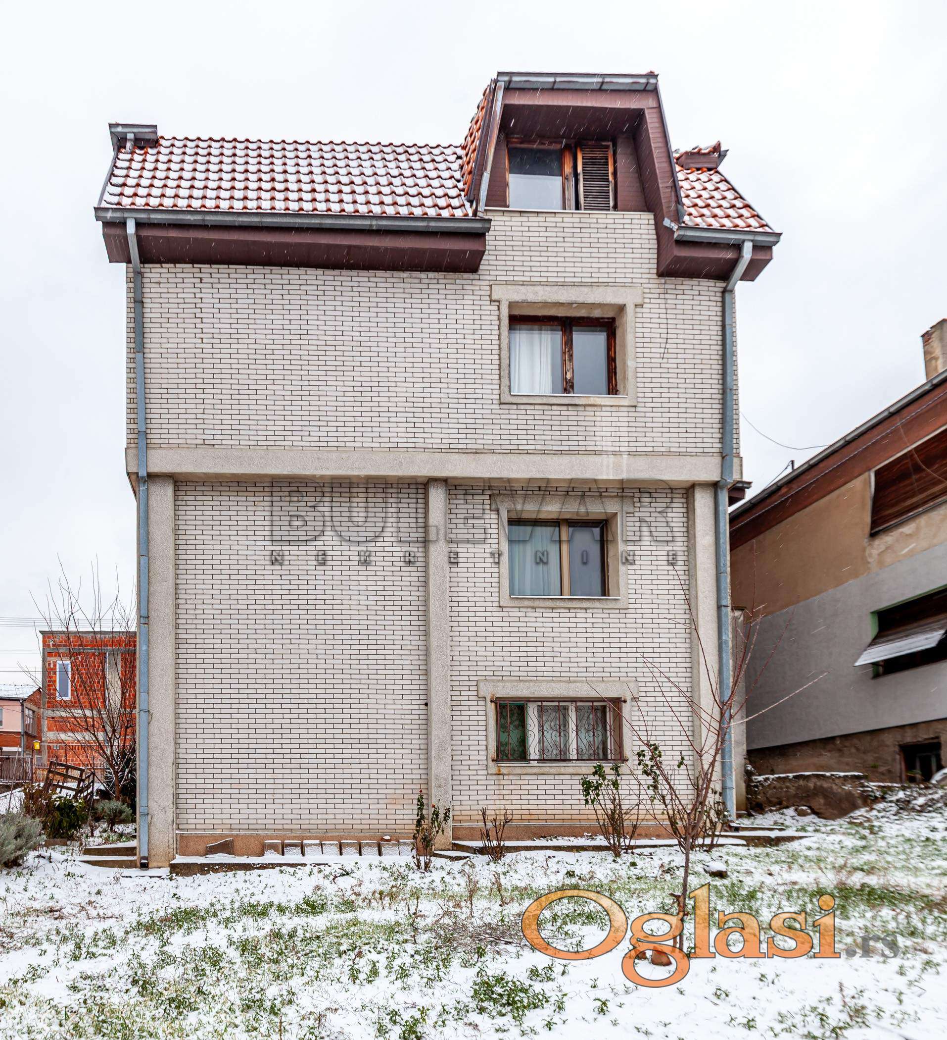 Kuća je u osnovi 80m2, spratnosti sut+vpr+1+pk, korisne površine 320m2 . Nalazi se na placu ukupne površine 476m2. Suteren je u ravni sa zemljom i sastoji se od ulaznog hodnika, kupatila, rešo kuhinje, dnevnog boravka i dve spavaće sobe. Visoko prizemlje je sličnog rasporeda kao suteren, osim dograđene zastakljene lođe celom širinom kuće, koja je veoma funkcionalna, jer uz već postojeći glavni ulaz za stan, ima još dva dodatna ulaza sa obe strane lođe, koji vode direktno do dvorišta. U nastavku, u sklopu prizemne etaže, nalazi se garaža, sa direktnim pristupom na ulicu. Prvi sprat je u funkciji trosobnog stana sa veoma funkcionalnim rasporedom prostorija. Sastoji se od centralnog hodnika, velikog dnevnog boravka sa trpezarijom i kuhinjom, velike lođe, kupatila i dve spavaće sobe sa izlazom na lođu. Iznad dela garaže je još jedna prelepa nadkrivena terasa do koje je pristup iz stepeništa na etaži na prvom spratu. Sve tri etaže, osim suterena, povezuje unutrašnje stepenište kao u zgradi. Ispod nivoa garaže nalazi se podrum sa dve prostorije. Potkrovlje je u sivoj fazi, sa prelepim pogledom na grad. Sastoji se od jedne velike prostorije, prostorije predviđene za kupatilo i velike terase. Ima velikog potencijala za uređenje enterijera shodno potrebama budućeg vlasnika. Iza kuće je slobodno, lepo dvorište, površine 340m2, gde se nalazi manji pomoćni objekat u funkciji ostave...