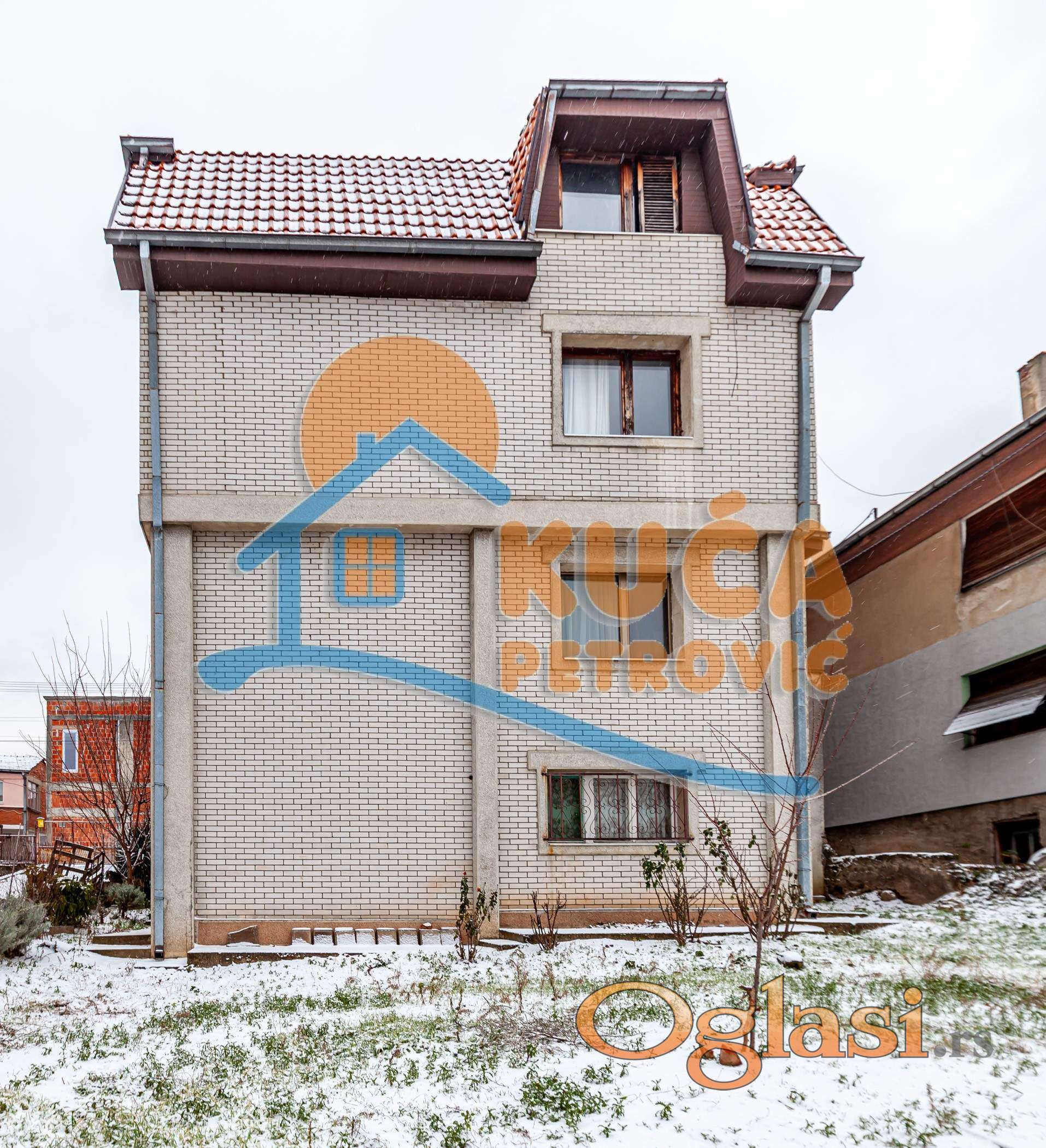 Na prodaju odlična porodična kuća u naselju Apelovac iznad Niške pivare. U blizini su osnovna škola, pošta, marketi. Nalazi se u mirnom i lepom okruženju za porodično stanovanje, kao i za izdavanje. Kuća je u osnovi 80m2, spratnosti sut+vpr+1+pk, korisne površine 320m2 . Nalazi se na placu ukupne površine 476m2. Suteren je u ravni sa zemljom i sastoji se od ulaznog hodnika, kupatila, rešo kuhinje, dnevnog boravka i dve spavaće sobe. Visoko prizemlje je sličnog rasporeda kao suteren, osim dograđene zastakljene lođe celom širinom kuće, koja je veoma funkcionalna, jer uz već postojeći glavni ulaz za stan, ima još dva dodatna ulaza sa obe strane lođe, koji vode direktno do dvorišta. U nastavku, u sklopu prizemne etaže, nalazi se garaža, sa direktnim pristupom na ulicu. Prvi sprat je u funkciji trosobnog stana sa veoma funkcionalnim rasporedom prostorija. Sastoji se od centralnog hodnika, velikog dnevnog boravka sa trpezarijom i kuhinjom, velike lođe, kupatila i dve spavaće sobe sa izlazom na lođu. Iznad dela garaže je još jedna prelepa nadkrivena terasa do koje je pristup iz stepeništa na etaži na prvom spratu. Sve tri etaže, osim suterena, povezuje unutrašnje stepenište kao u zgradi. Ispod nivoa garaže nalazi se podrum sa dve prostorije. Potkrovlje je u sivoj fazi, sa prelepim pogledom na grad. Sastoji se od jedne velike prostorije, prostorije predviđene za kupatilo i velike terase. Ima velikog potencijala za uređenje enterijera shodno potrebama budućeg vlasnika. Iza kuće je slobodno, lepo dvorište, površine 340m2, gde se nalazi manji pomoćni objekat u funkciji ostave... Kuća je izuzetno kvalitetne gradnje, u izvornom stanju. Spoljna stolarija je kombinovana, kvalitetna - pvc i drvena sa termo prekidom. Izvorna keramika, parket i laminat na podovima. U kući su postavljeni radijatori i cela instalacija za etažno grejanje, za sve etaže osim potkrovlja, neophodan je samo kotao. Odlična spoljna izolacija, objekat je obložen fasadnom ciglom. Kuća je sa upotrebnom dozvolom (za suteren i prizemlje). Topla preporuka naše agencije!! Ovo je samo deo naše ponude, ovu kao i druge nekretnine sa većim brojem fotografija možete pogledati na našem sajtu