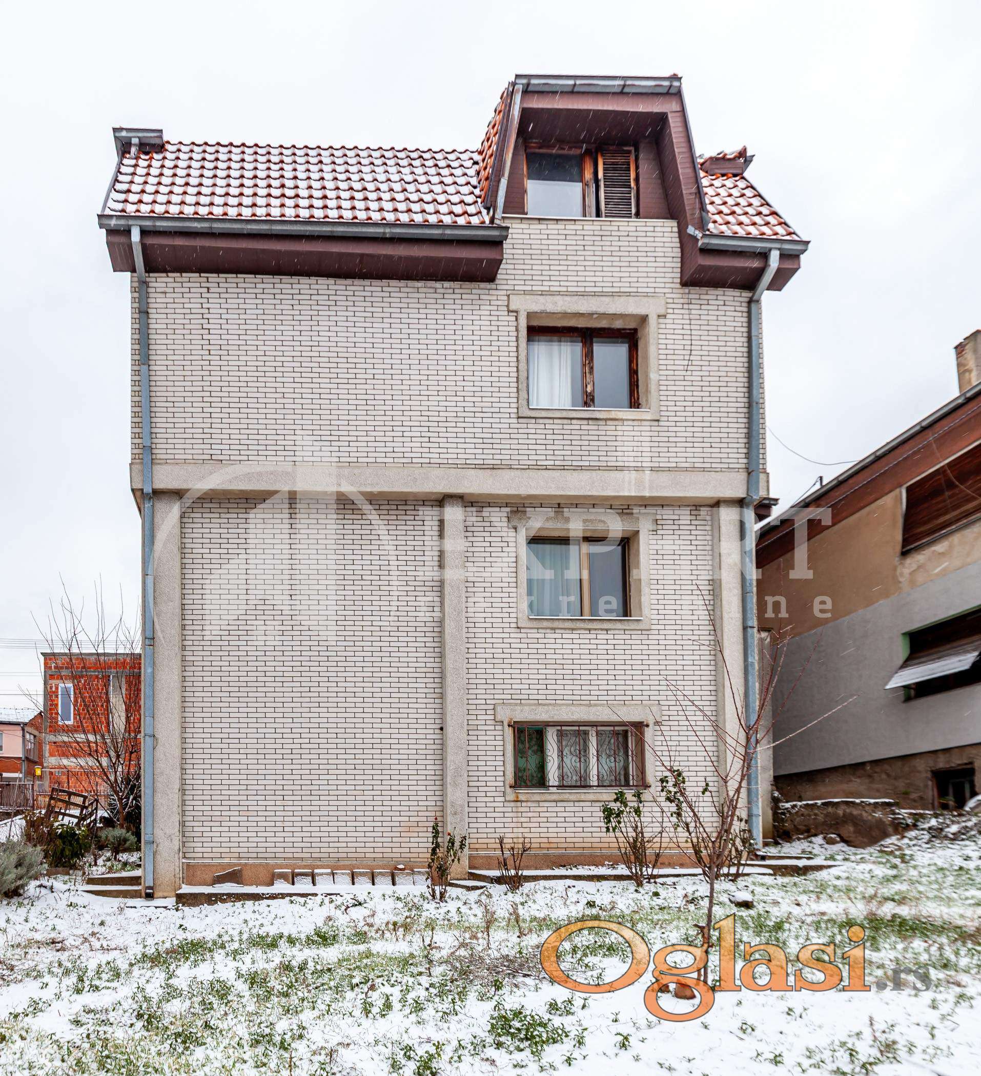 Kuća je u osnovi 80m2, spratnosti sut+vpr+1+pk, korisne površine 320m2 . Nalazi se na placu ukupne površine 476m2. Suteren je u ravni sa zemljom i sastoji se od ulaznog hodnika, kupatila, rešo kuhinje, dnevnog boravka i dve spavaće sobe. Visoko prizemlje je sličnog rasporeda kao suteren, osim dograđene zastakljene lođe celom širinom kuće, koja je veoma funkcionalna, jer uz već postojeći glavni ulaz za stan, ima još dva dodatna ulaza sa obe strane lođe, koji vode direktno do dvorišta. U nastavku, u sklopu prizemne etaže, nalazi se garaža, sa direktnim pristupom na ulicu. Prvi sprat je u funkciji trosobnog stana sa veoma funkcionalnim rasporedom prostorija. Sastoji se od centralnog hodnika, velikog dnevnog boravka sa trpezarijom i kuhinjom, velike lođe, kupatila i dve spavaće sobe sa izlazom na lođu. Iznad dela garaže je još jedna prelepa nadkrivena terasa do koje je pristup iz stepeništa na etaži na prvom spratu. Sve tri etaže, osim suterena, povezuje unutrašnje stepenište kao u zgradi. Ispod nivoa garaže nalazi se podrum sa dve prostorije. Potkrovlje je u sivoj fazi, sa prelepim pogledom na grad. Sastoji se od jedne velike prostorije, prostorije predviđene za kupatilo i velike terase. Ima velikog potencijala za uređenje enterijera shodno potrebama budućeg vlasnika. Iza kuće je slobodno, lepo dvorište, površine 340m2, gde se nalazi manji pomoćni objekat u funkciji ostave...