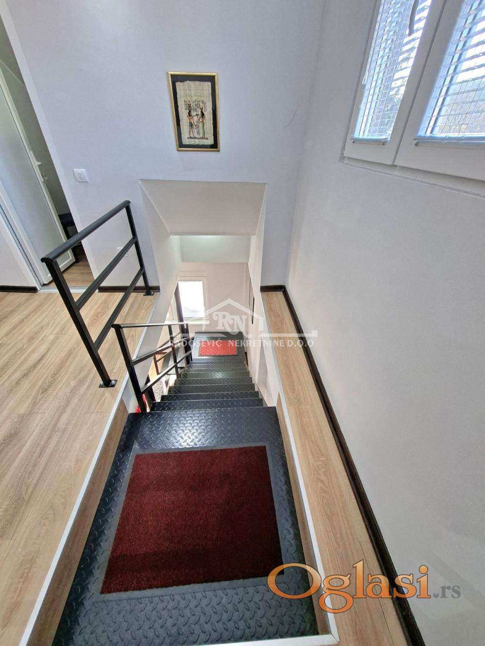 • PRIZEMLJE: Predsoblje, dve spavaće sobe sa ugrađenim američkim plakarima, kupatilo, dnevni boravak koji je veliki otvoreni prostor sa kuhinjom italijanskog dizajna sa pultom. Poseban prostor za veš mašinu sa policama. Grejanje: u svakoj prostoriji nalazi se TA peć, kao i peć na drva; isto rešenje i na gornjem spratu, klima uređaji na svakom spratu.