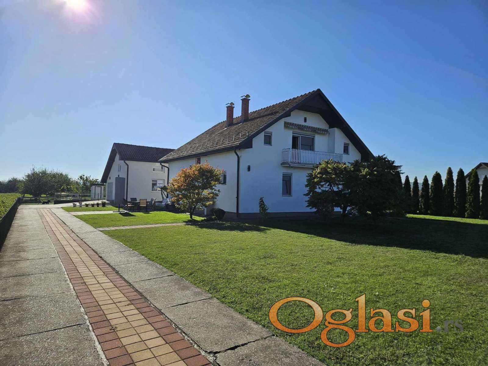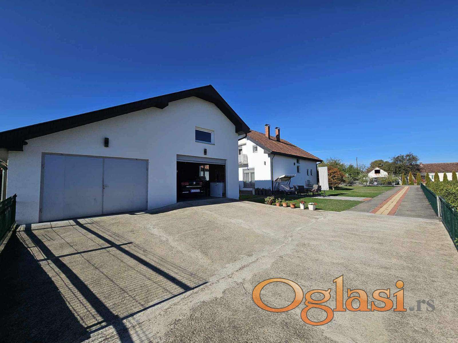 Na placu površine 44 ara nalazi se porodična kuća od 200 m², kao i pomoćni objekat od 135 m² sa dve garaže, što pruža veliki potencijal za radionicu, skladište, dodatni stambeni prostor ili porodični biznis.