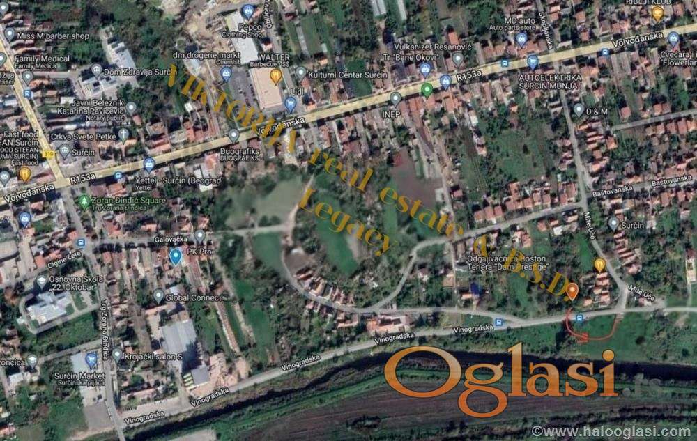 Na prodaju građevinsko zemljište u izuzetnoj zoni Surčina, površine 26 ari , sa frontom od 25 metara uz asfaltirani put.