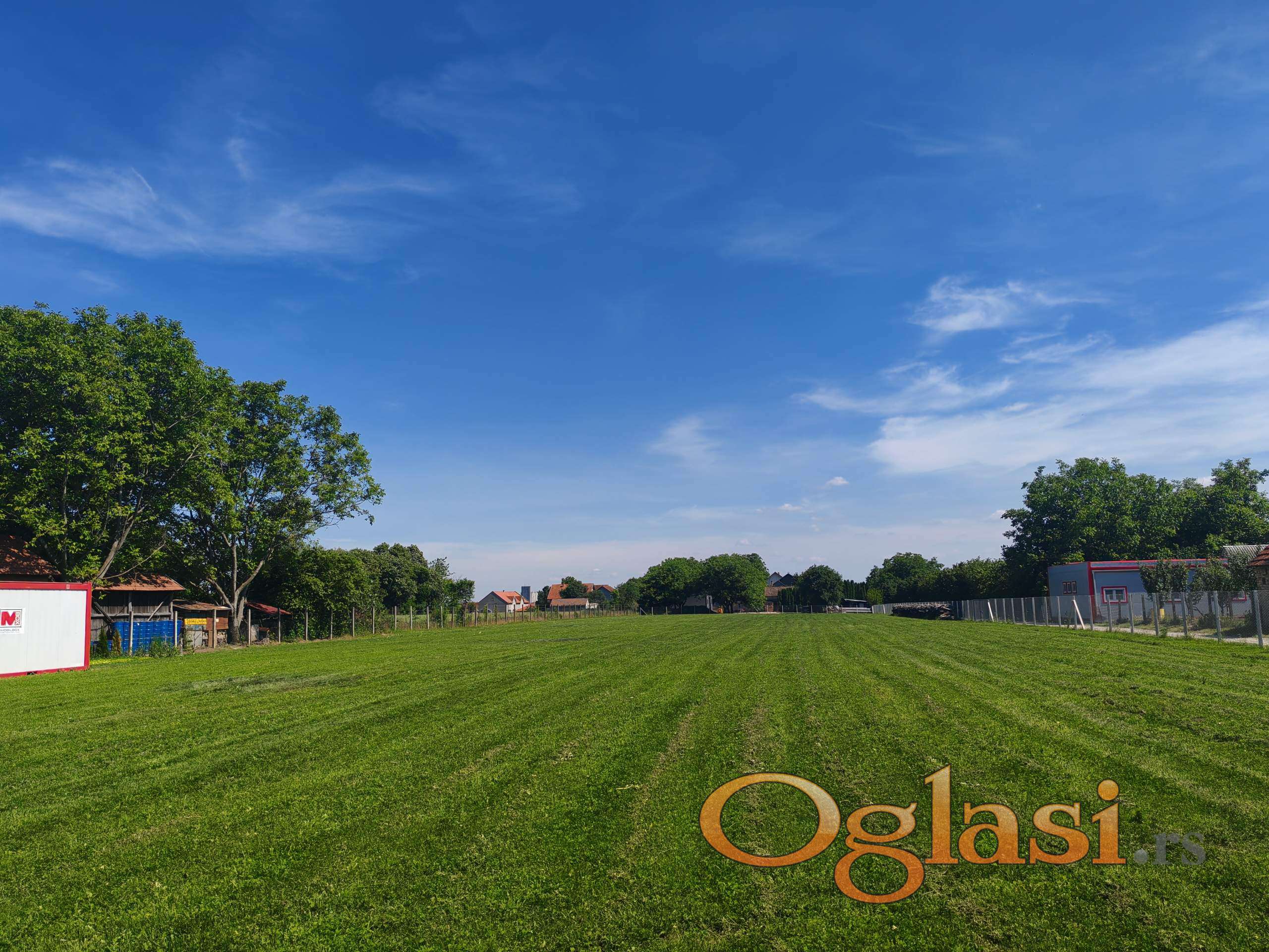 Ogradjen betonskim stubovima i zicom, zasadjena trava preko celog placa.