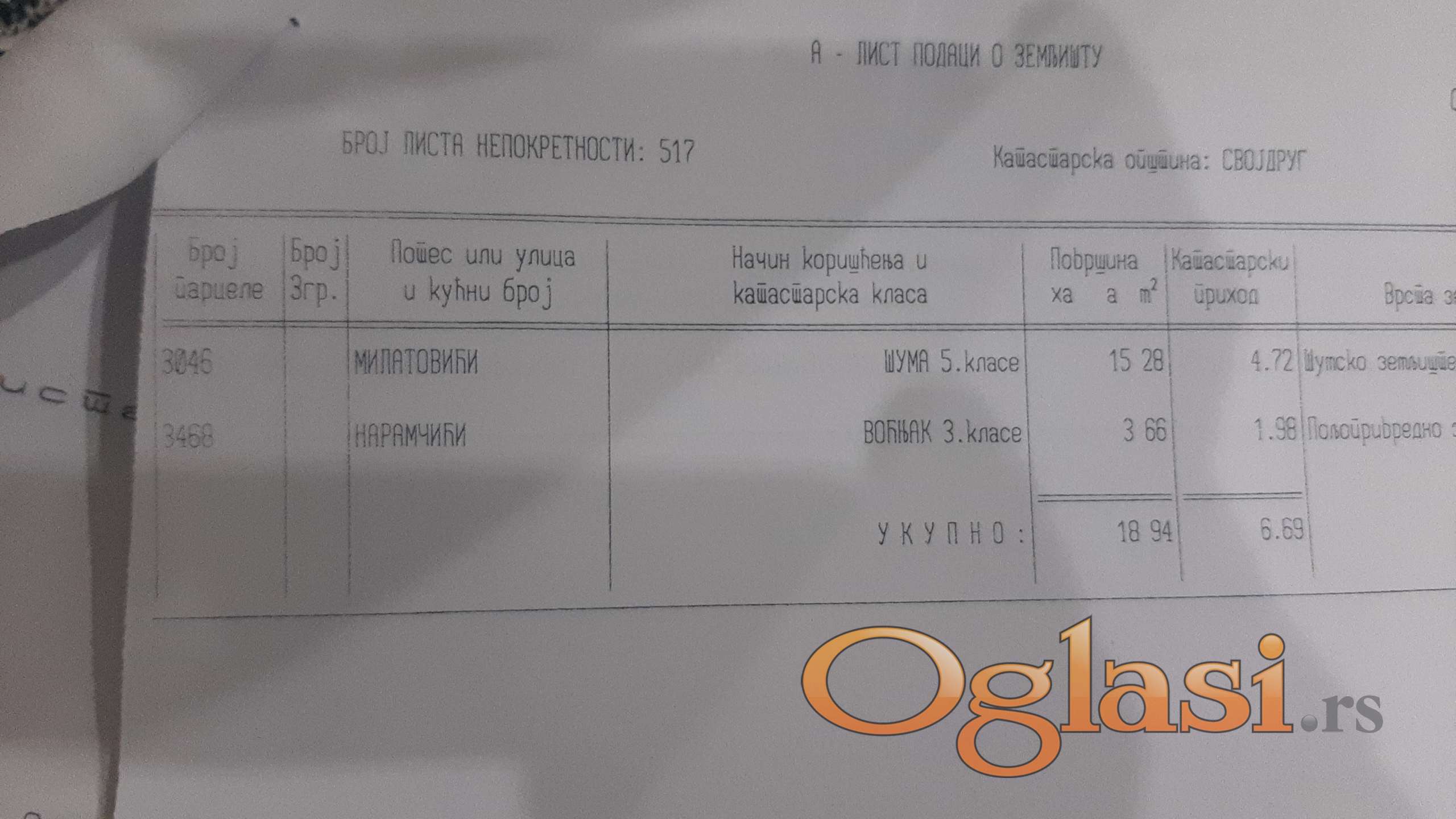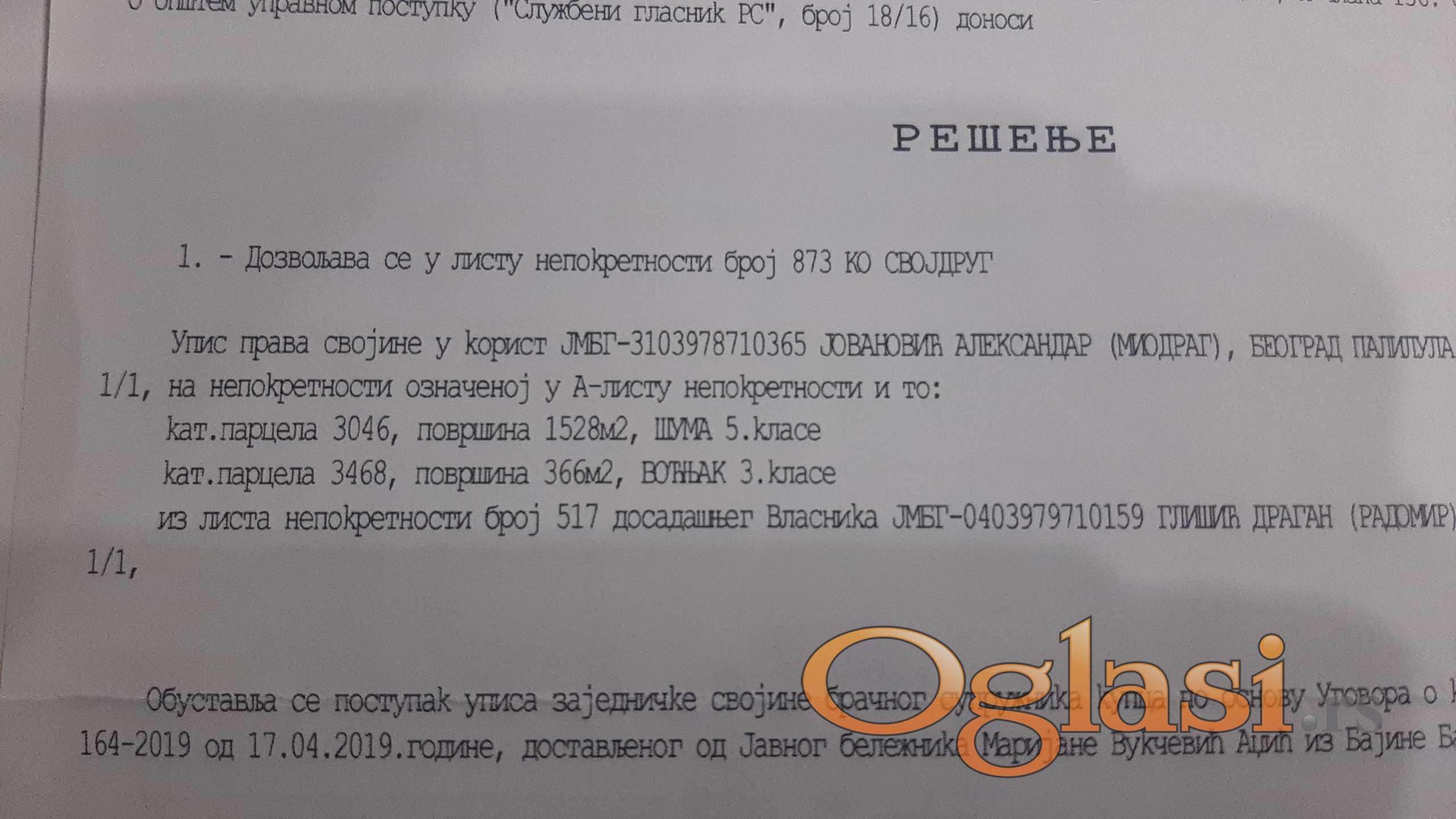 Dva placa prodaju se u celosti,u mestu rogacica -svoj drug,jedan je suma oko16ari koja nije dirana barem30 godinai vise,drugi se vodi kao vocnjakoko 3,66 pogodan za vikendicu i nalazi se pored puta,