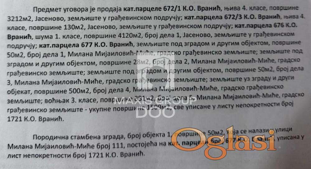 BROJ U REGISTRU POSREDNIKA 1850 PLAC NA PRODAJU – BARAJEVO | NASELJE VRANIĆ | ODLIČNA PRILIKA ZA INVESTICIJU I GRADNJU Lokacija: Barajevo – naselje Vranić Ukupna površina zemljišta: 8.971 m² Uknjiženo 1/1 U ponudi je veći plac koji se sastoji od više katastarskih parcela, smešten u mirnom i prirodnom okruženju naselja Vranić, opština Barajevo. Parcela predstavlja odličnu priliku za izgradnju porodičnog imanja, više kuća, vikend objekta ili investicioni projekat. Zemljište se nalazi u zoni gradskog građevinskog zemljišta i ima potencijal za različite namene, uz prijatan ambijent prirode i dobru povezanost sa Beogradom. OSNOVNE INFORMACIJE Ukupna površina: 8.971 m² Katastarske parcele: 672/1 672/3 676 677 Struktura parcela: Parcela 672/1 – njiva 4. klase, gradsko građevinsko zemljište, površine 3.212 m² Parcela 672/3 – njiva 4. klase, gradsko građevinsko zemljište, površine 130 m² Parcela 676 – šuma 1. klase, gradsko građevinsko zemljište Parcela 677 – površine 1.509 m² Uknjiženo vlasništvo 1/1 Bez tereta i zabeležbi Mirno i prirodno okruženje idealno za porodični život, vikendicu ili investiciju u izgradnju. Za više informacija i organizaciju obilaska: 📑 Agencijska provizija: 2% 📞 Pozovite nas i zakažite obilazak već danas! 👤 Agent prodaje: Bojan Vranić, licenca br. 5744 🏢 MAXIS GROUP DOO BEOGRAD 📍 Hercegovačka 15/303, BW Simfonija 2, III sprat, kancelarija 303 🔹 Broj u registru posrednika: 1850 📑 Agencijska provizija: 2% 📞 Pozovite nas i zakažite obilazak već danas! ☎️ 060/0660429 👤 Agent prodaje: Bojan Vranić, licenca br. 5744 kat. parc: Vredna investicija! 📑 Agencijska provizija: 2% 📞 Pozovite nas i zakažite obilazak već danas! ☎️ 060/0660429 👤 Agent prodaje: Bojan Vranić, licenca br. 5744 📍 MAXIS GROUP DOO BEOGRAD Hercegovačka 15/303, BW Simfonija 2, 3. sprat, kancelarija 303 ☎️ 011/7644890 Agencijska provizija 2%
