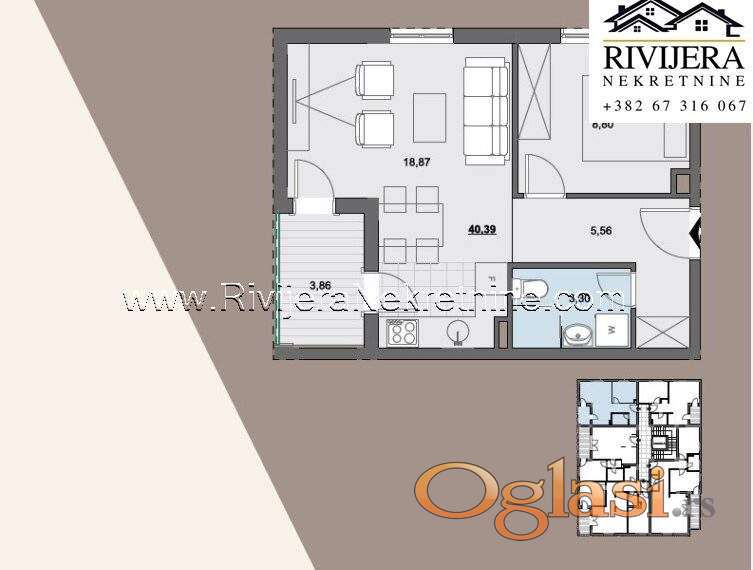 Povrsina stana 41 m2. Dostupni na prodaju su jednosobni stanovi razlicite spratnosti i pozicije u zgradi. Visok kvalitet gradnje i ugradjenih materijala.