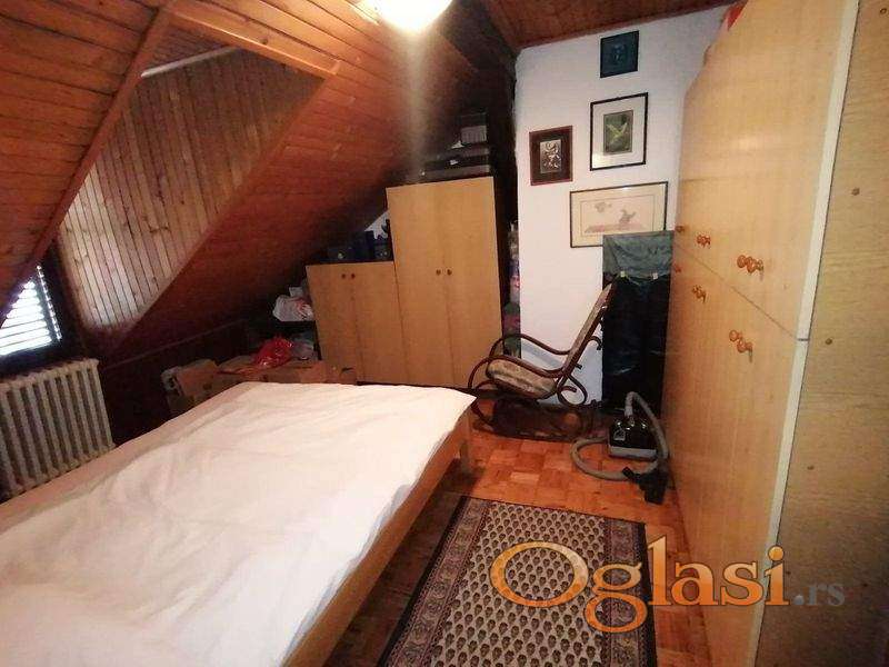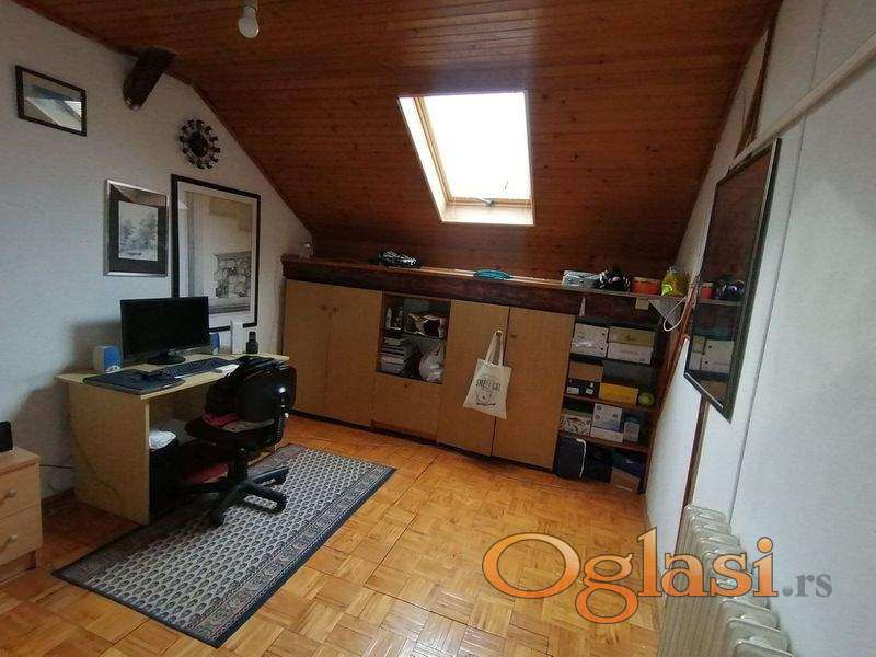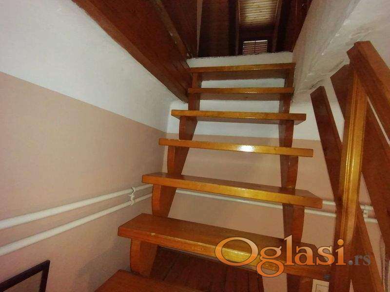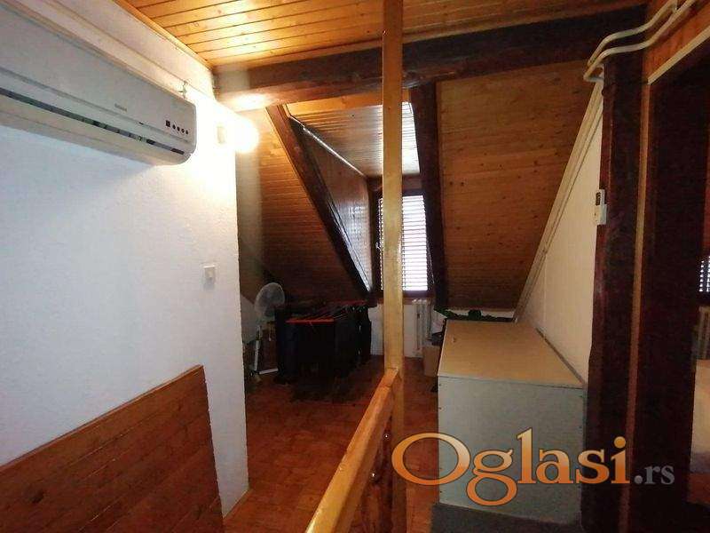 Komforan četvorosoban stan, dvostrano orijentisan (ulica i dvorište), prizemlje i potkrovlje: četiri sobe, predsoblje, odvojena kuhinja sa trpezarijom, dva kupatila i WC-a, ulaz, hodnik i ostava. Objekat je pogodan i za poslovni prostor. Može se pretvoriti u pet kancelarija ili lokal i četiri kancelarije. Uknjižen. Poseban ulaz u stan – iz pasaža. Kolski ulaz u dvorište. Etažno grejanje na gas, dve klime, telefon, priključci za kablovsku TV i internet. Ukupna površina 98 m2, plus zidana šupa i parking mesto u dvorištu. Moguć svaki dogovor i korekcija cene.