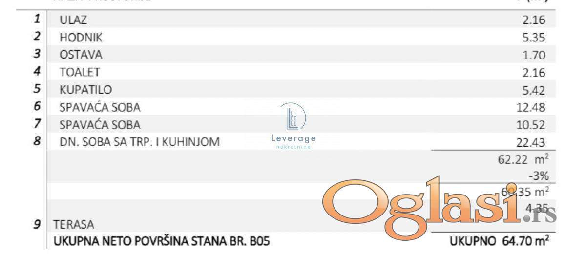 Ovaj stan se sastoji od dnevne sobe sa kuhinjom i trpezarijom, dve spavaće sobe, kupatila, toaleta, ostave, hodnika, ulaza i terase.