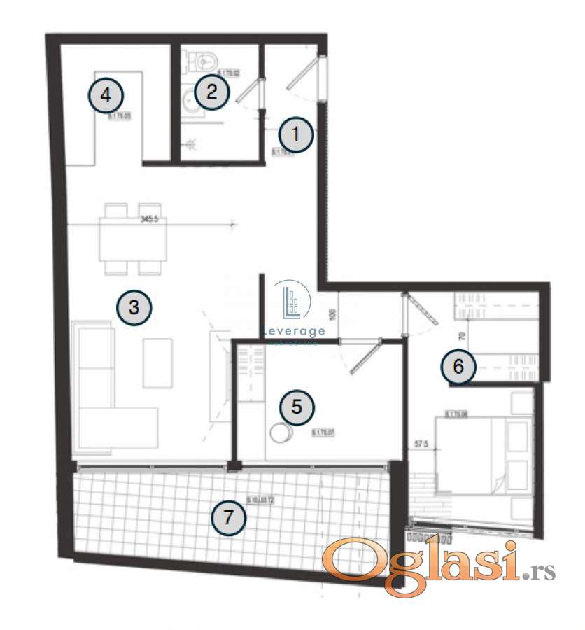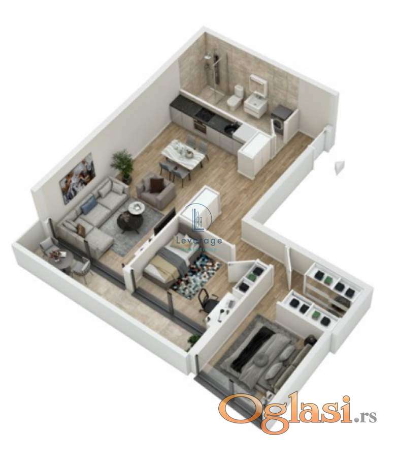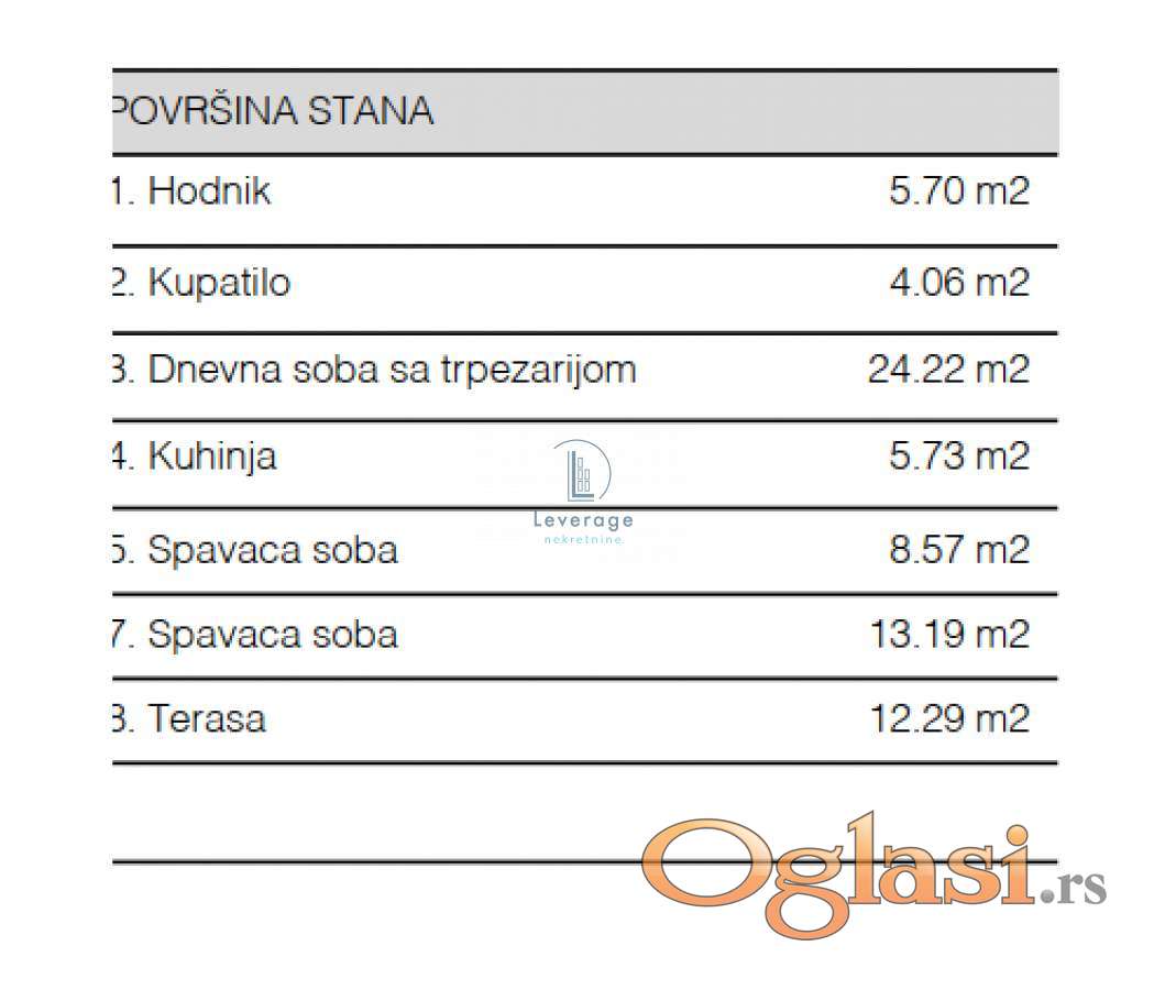 Raspored stana pruža osećaj prostranosti i topline – hodnik vodi u prostranu dnevnu sobu sa trpezarijom i kuhinjom, dok su dve spavaće sobe povučene u mirniji deo stana. Kupatilo je moderno i funkcionalno, a terasa pruža dodatni prostor za uživanje u svakom godišnjem dobu.