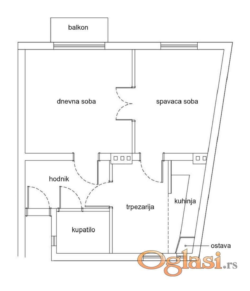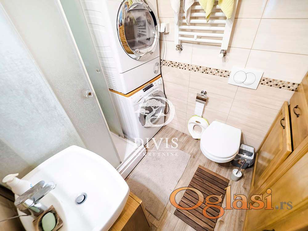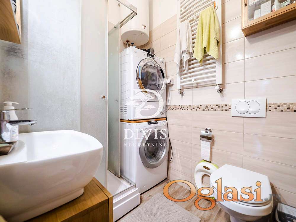 Sastoji se od ulaznog hodnika, prostranog dnevnog boravka sa izlazom na terasu, spavaće sobe, odvojene kuhinje sa trpezarijskim delom i kupatila.Kompletno je renoviran i tom prilikom su zamenjene sve elektro i vodovodne instalacije, zamenjena stolarija, postavljen brodski pod. Dvostrano je orijentisan ( istok - zapad ), osvetljen tokom celog dana. Visina plafona je 3m. Etažno grejanje.