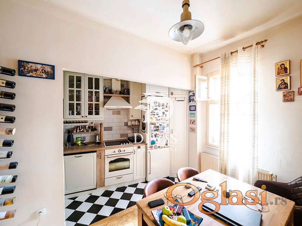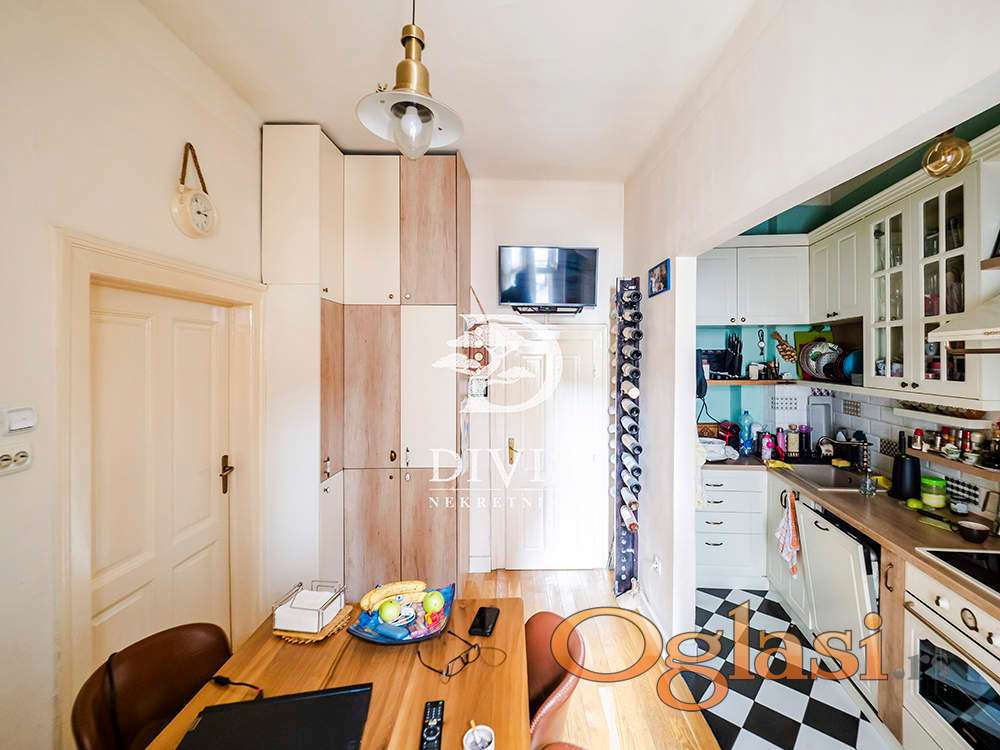 Prodajemo odličan dvosoban stan na prvom spratu u salonskoj zgradi iz 1936 godine, na Neimaru, u Hadži Melentijevoj ulici.