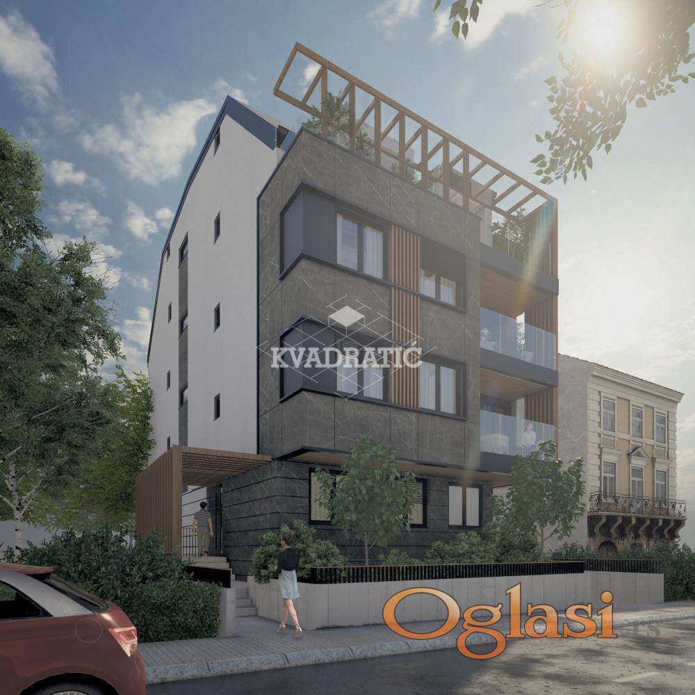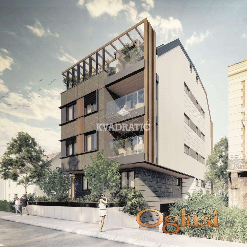 Stan se nalazina potkrovlju zgrade koja ima 3 sprata. Stan je uknjižen na 142m2m2 a ukupno ima 175 m2 po strukturi je petosoban, trostrano orijentisan, organizovan kao duplex gder na donjoj etaži ima tri spavaće sobe sa dva kupatila, u u gornjem delu prostran dnevni boravak sa kuhinjom , trpezarijom, gostinjski wc, i jednoj master sobi sa kupatilom i garderoberom. Sa terase se pruža prelep pogled ka zelenilu, a iz dnevnog boravka se vidi i Hram Svetog Save. Stan je sa minimalnim kosinama.