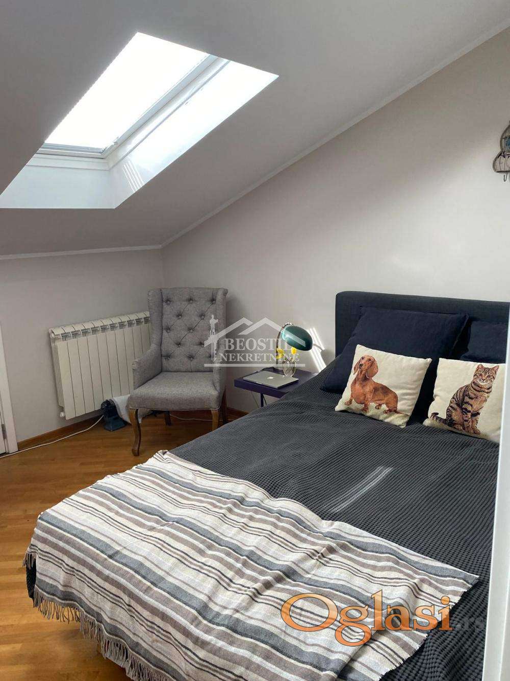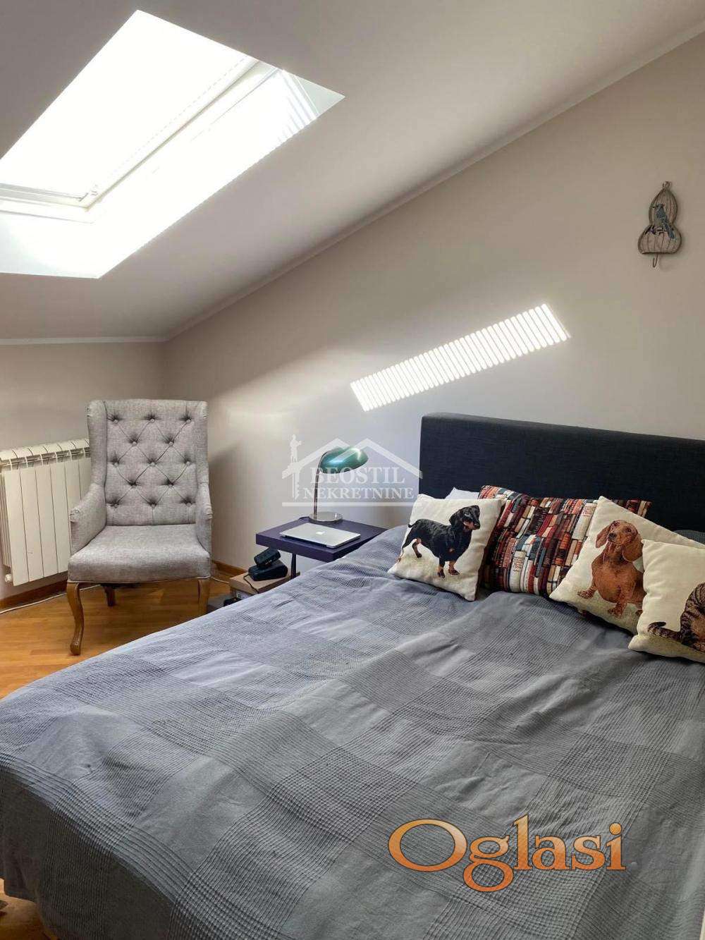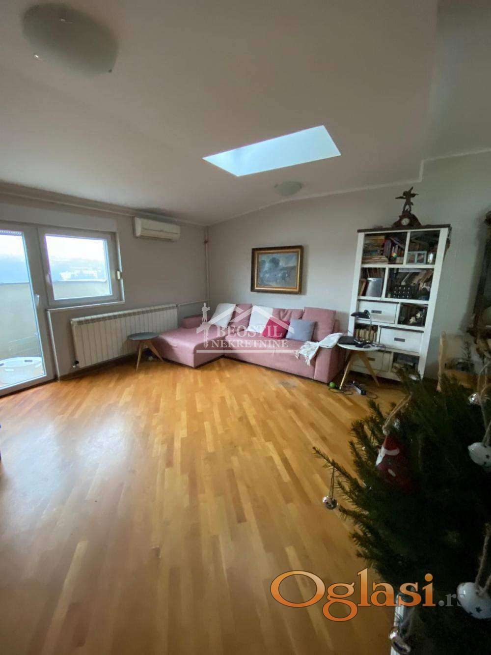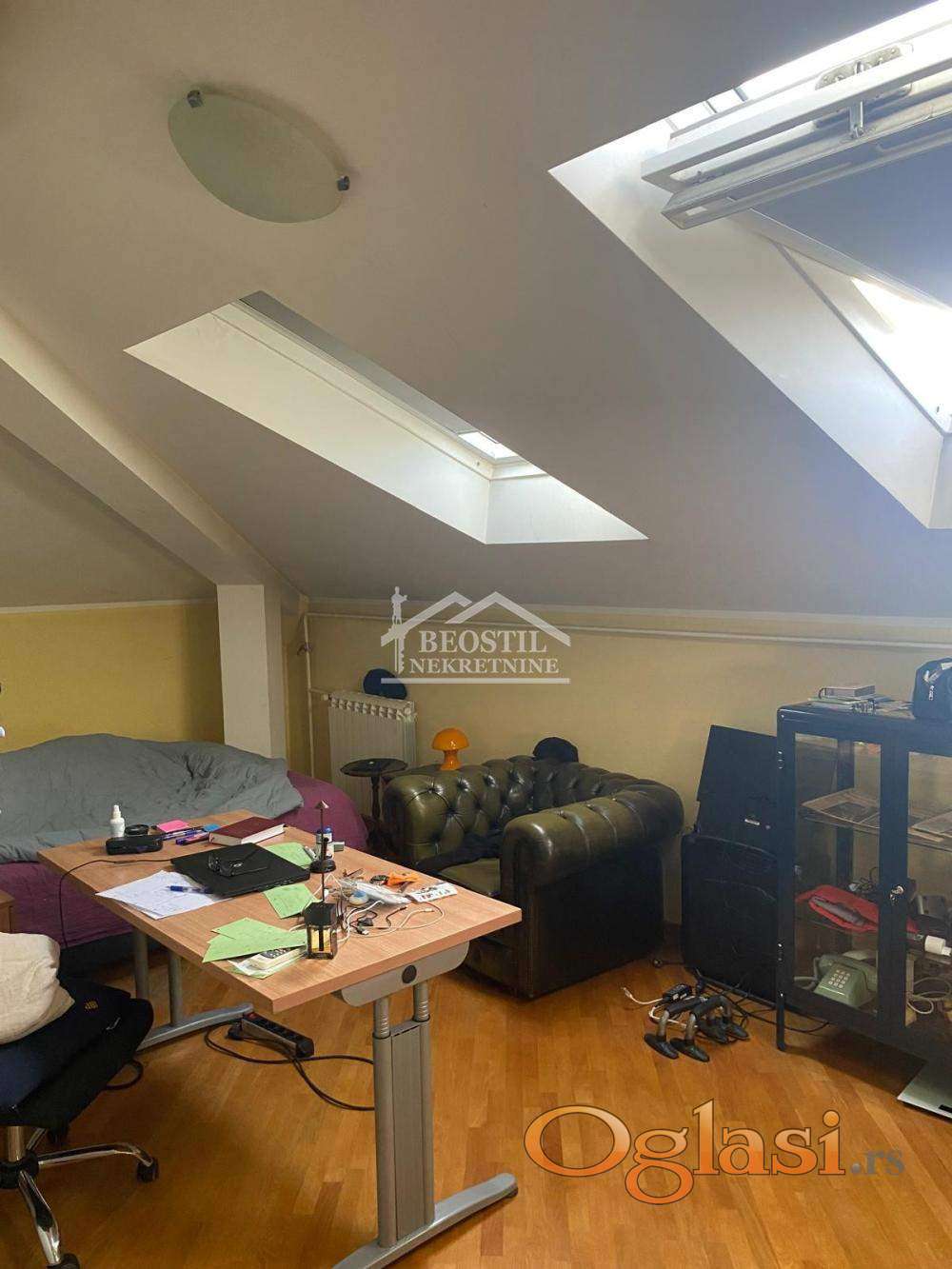U prodajnu cenu je uključeno i uknjiženo garažno mesto od 13m2 (na klackalici). Ulazni deo stana se sastoji iz hodnika sa visokim plafonima i prirodnim osvetljenjem, iz kojeg se ulazi u sve prostorije; stan ima jedno veće kupatilo (sa prirodnim osvetljenjem), zatim prostoriju koja služi kao garderober, dve spavaće sobe (koje imaju kosine i krovne prozore i prostor za odlaganje u kosinama), dnevno-trpezarijski prostor sa kuhinjom i lođu sa pogledom na Dedinje i Bajfordovu šumu.Zgrada je izuzetno kvalitetno građena, stan se odlikuje odličnom zvučnom i toplotnom izolacijom, a na poslednjem spratu se pored ovog stana nalazi samo još jedan stan, što ga čini izuzetno prijatnim za stanovanje (lift ide do 6. sprata). Stan je u dobrom stanju, potrebno je higijensko krečenje i manja ulaganja i brzo je useljiv. Važno je još reći da se ova nekretnina nalazi na izuzetnoj lokaciji jer su u neposrednom okruženju fakulteti - FON, Fakultet političkih nauka, kao i osnovne, srednje i više škole. Stan je okrenut ka mirnoj ulici, dok se s druge strane zgrade, duž Bulevara oslobođenja, prostire Bajfordova šuma od Zvezdinog stadiona sve do Banjice.