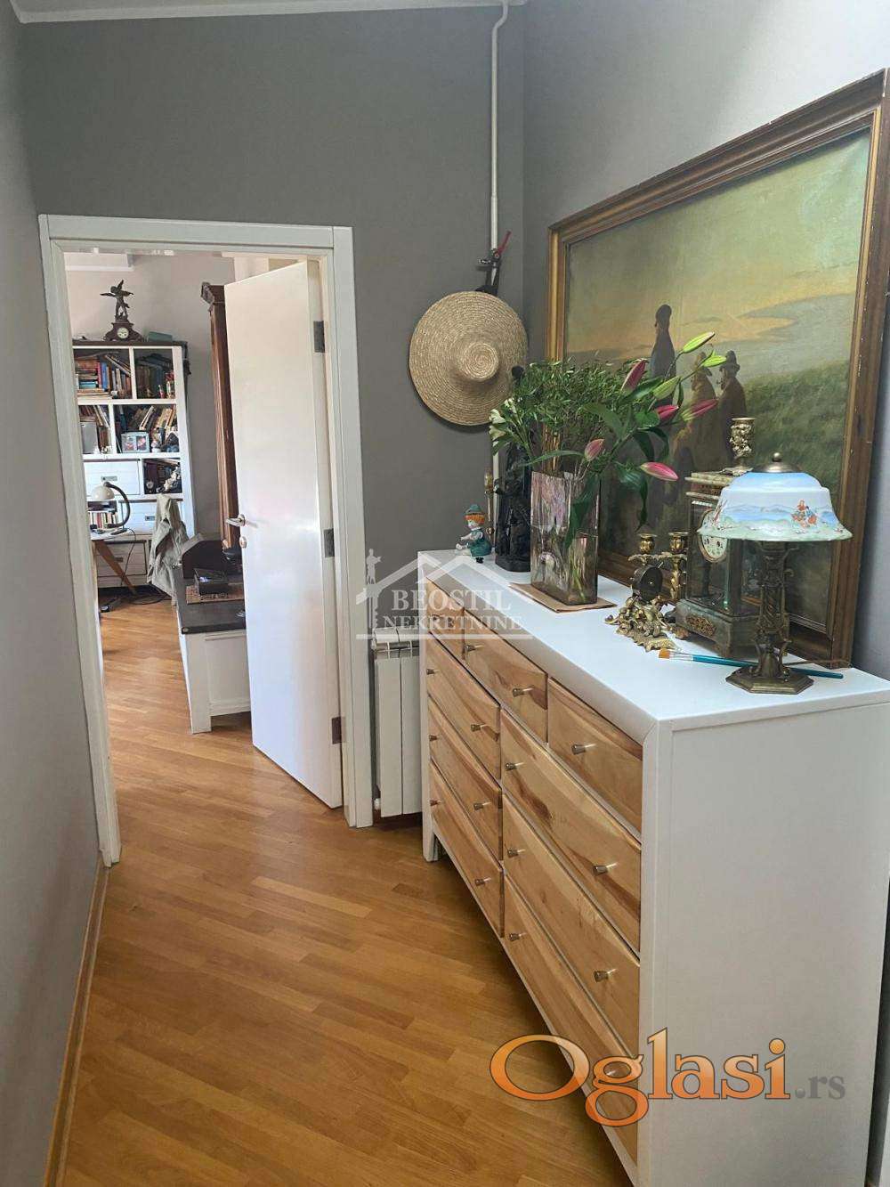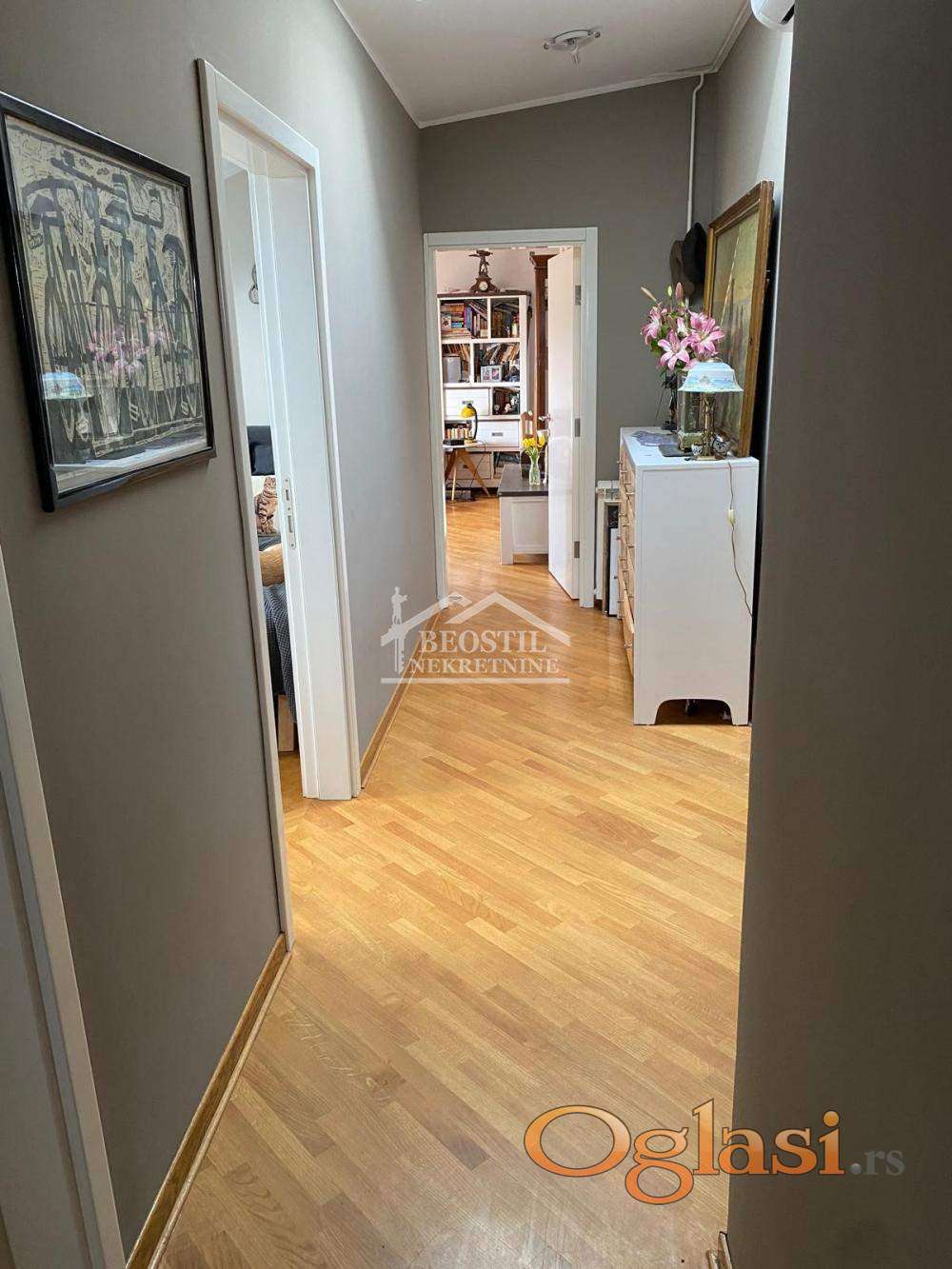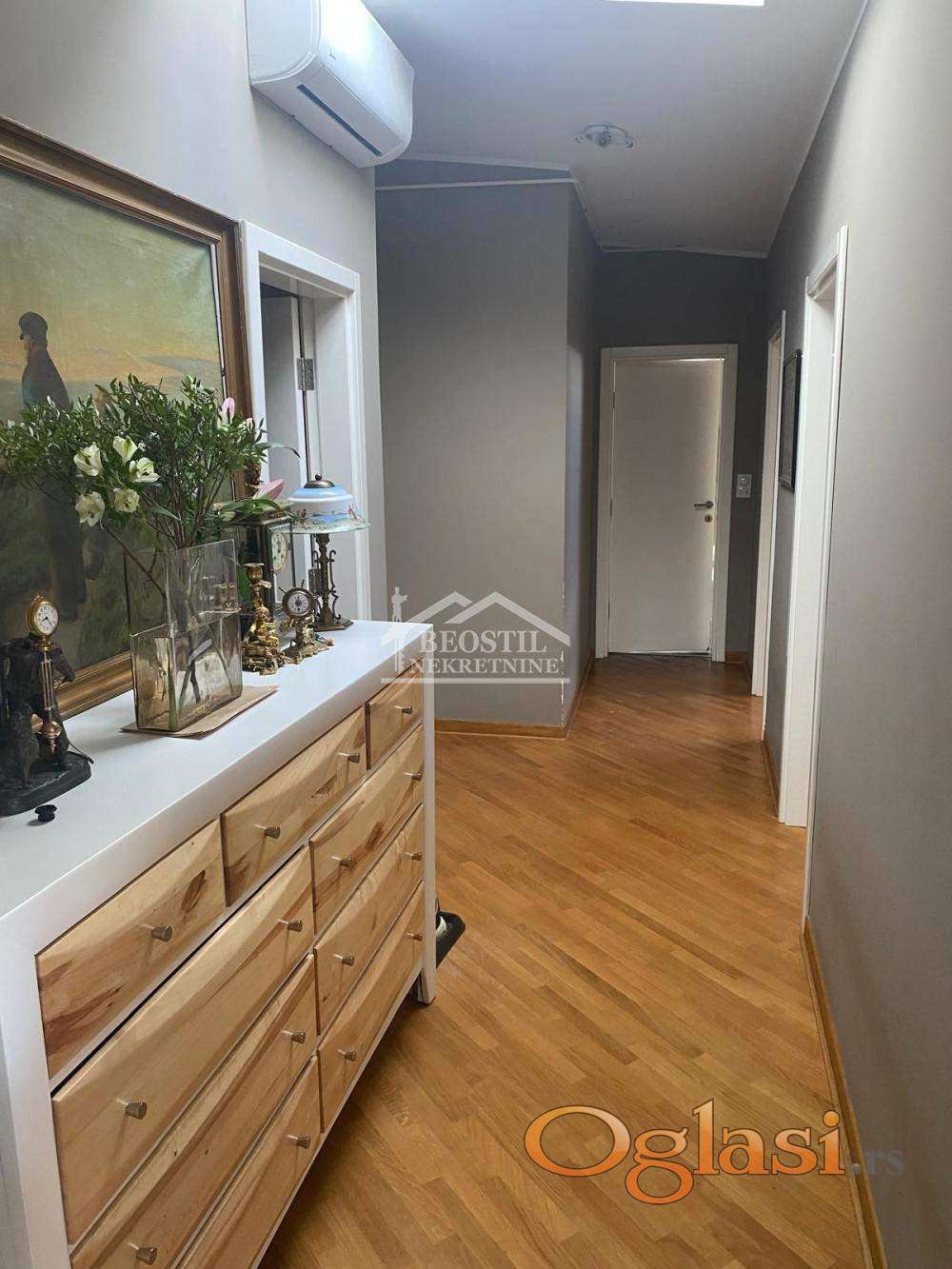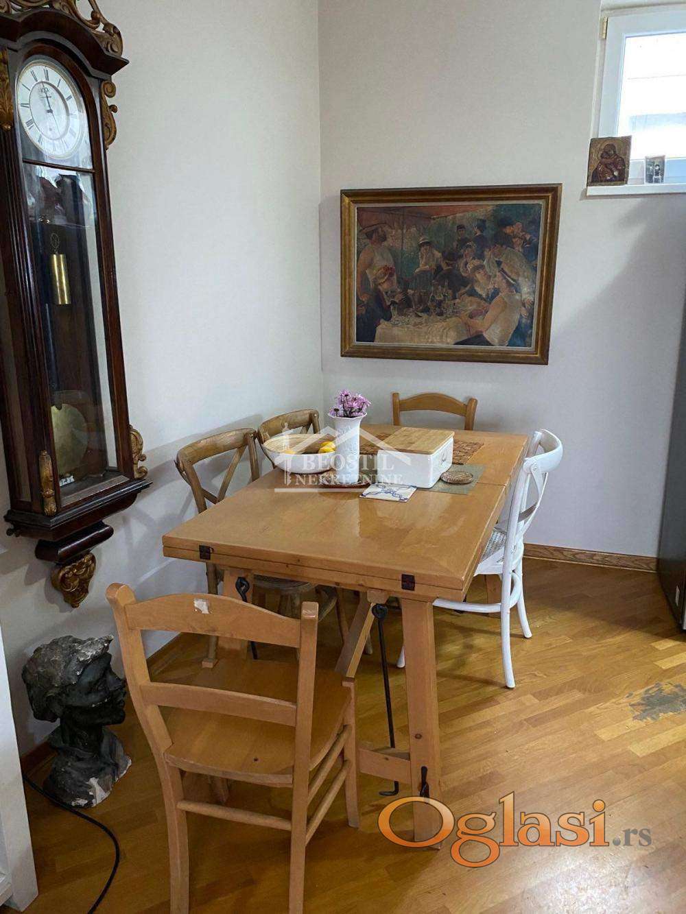 U prodajnu cenu je uključeno i uknjiženo garažno mesto od 13m2 (na klackalici). Ulazni deo stana se sastoji iz hodnika sa visokim plafonima i prirodnim osvetljenjem, iz kojeg se ulazi u sve prostorije; stan ima jedno veće kupatilo (sa prirodnim osvetljenjem), zatim prostoriju koja služi kao garderober, dve spavaće sobe (koje imaju kosine i krovne prozore i prostor za odlaganje u kosinama), dnevno-trpezarijski prostor sa kuhinjom i lođu sa pogledom na Dedinje i Bajfordovu šumu.Zgrada je izuzetno kvalitetno građena, stan se odlikuje odličnom zvučnom i toplotnom izolacijom, a na poslednjem spratu se pored ovog stana nalazi samo još jedan stan, što ga čini izuzetno prijatnim za stanovanje (lift ide do 6. sprata). Stan je u dobrom stanju, potrebno je higijensko krečenje i manja ulaganja i brzo je useljiv. Važno je još reći da se ova nekretnina nalazi na izuzetnoj lokaciji jer su u neposrednom okruženju fakulteti - FON, Fakultet političkih nauka, kao i osnovne, srednje i više škole. Stan je okrenut ka mirnoj ulici, dok se s druge strane zgrade, duž Bulevara oslobođenja, prostire Bajfordova šuma od Zvezdinog stadiona sve do Banjice.