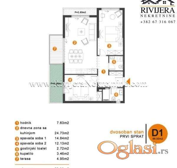 Struktura stana: Dnevni boravak sa kuhinjom, hodnik, toalet, kupatilo, terasa i dvije spavaće sobe.