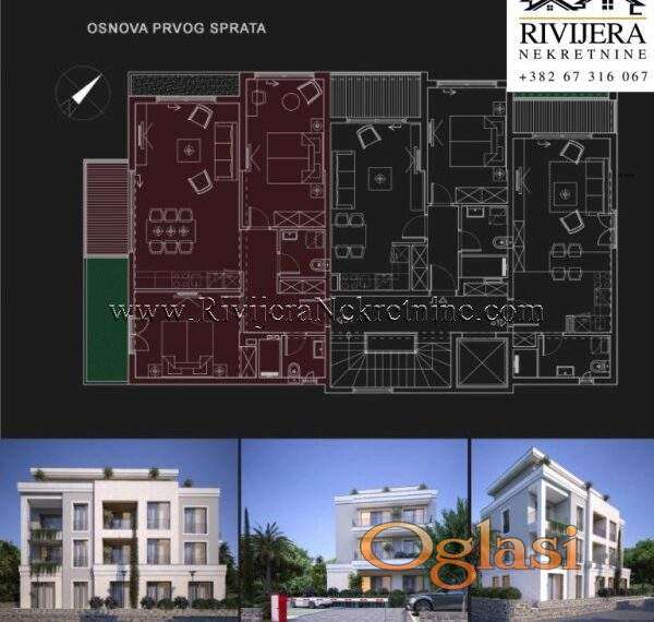 Prodaje se dvosoban stan u naselju Mrcevac, Tivat. Povrsina stana 78m2. Stan se nalazi na prvom spratu stambene zgrade u izgradnji. Unutrasnja povrsina stana je 68 m2 i pripada mu dodatnih 10 m2 zelene terase.