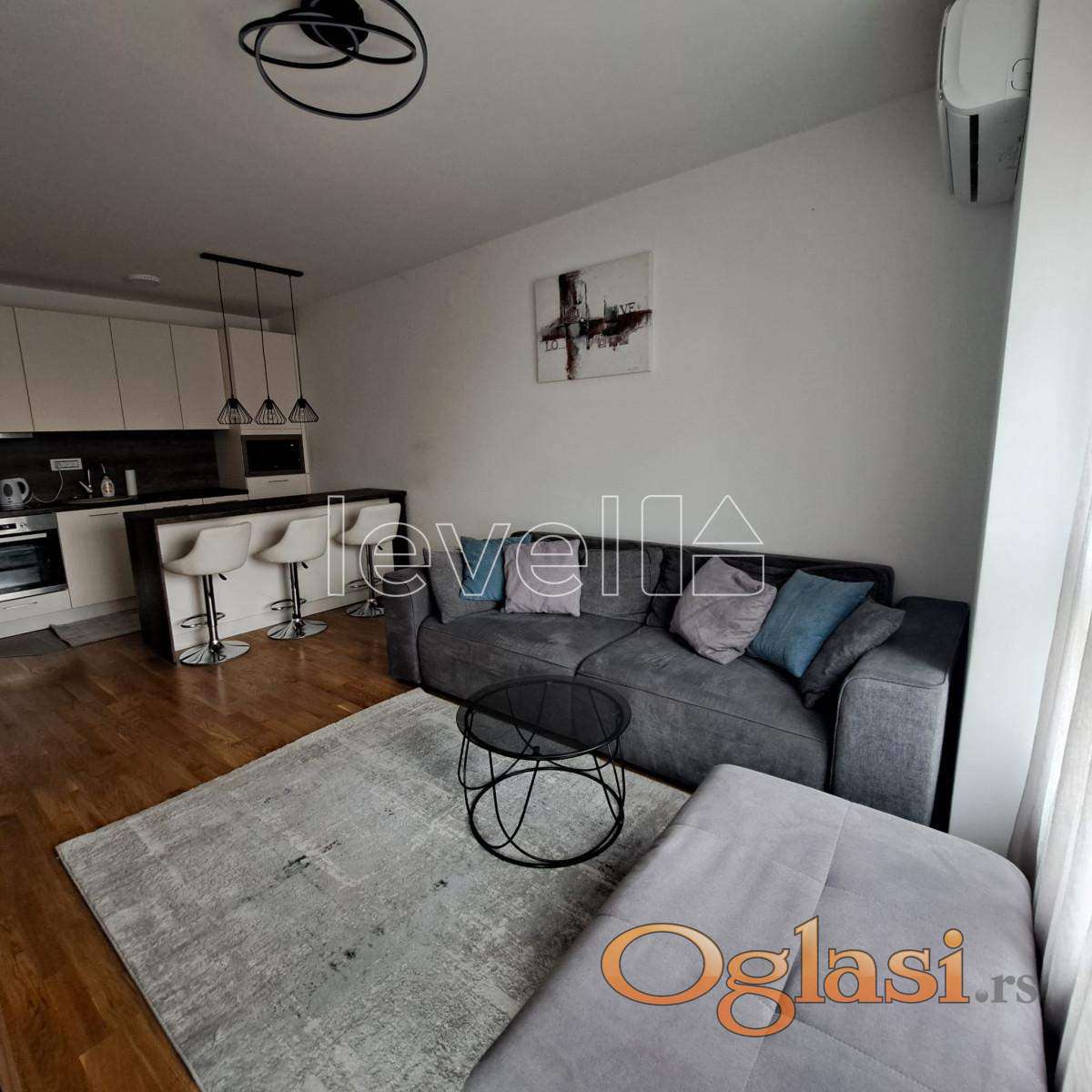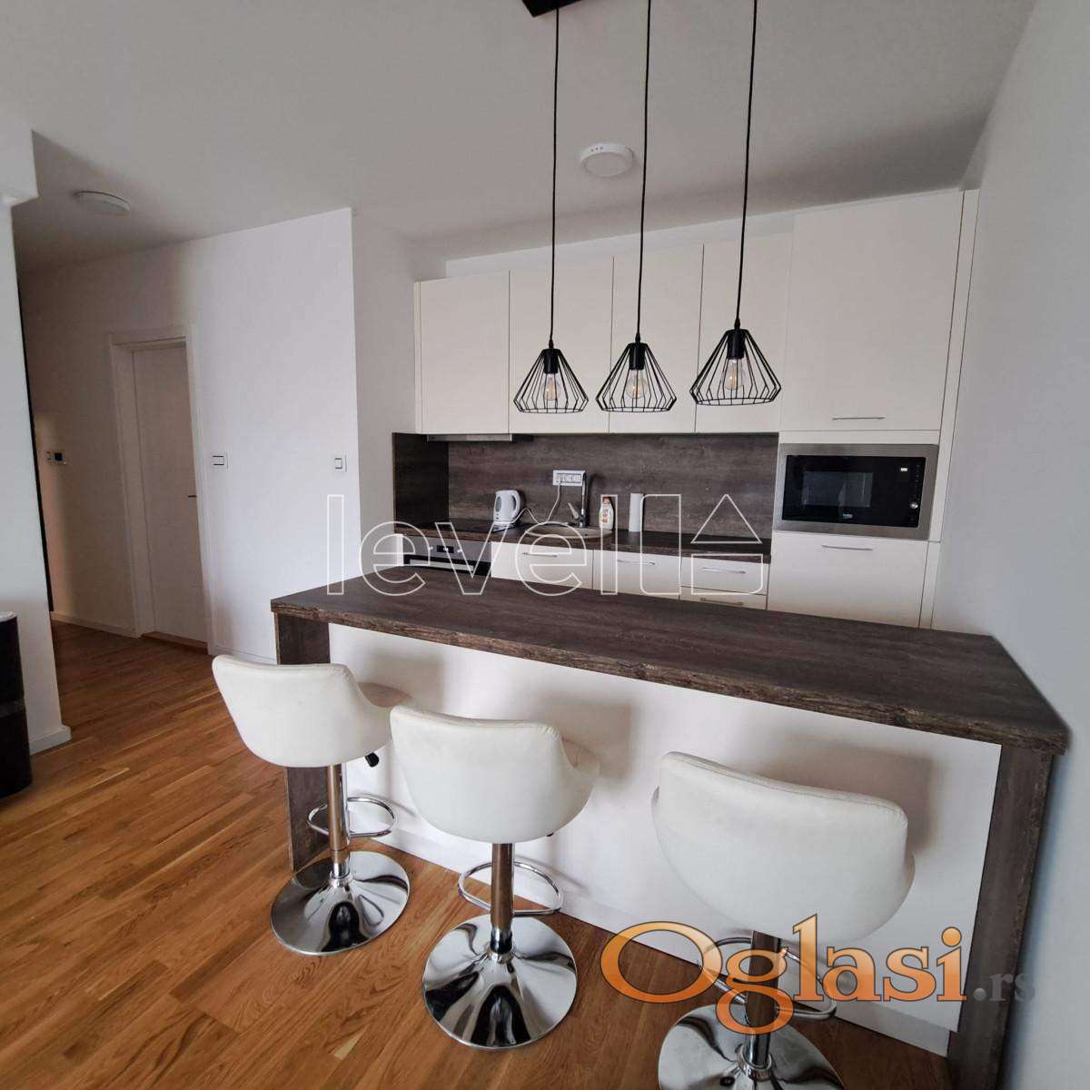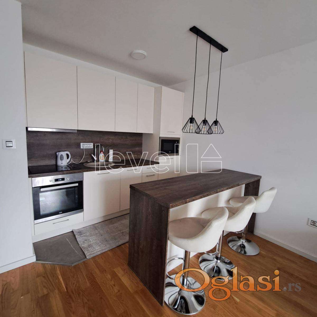 Komforna terasa, kuhinja sa šankom, novi uređaji, modernan nameštaj