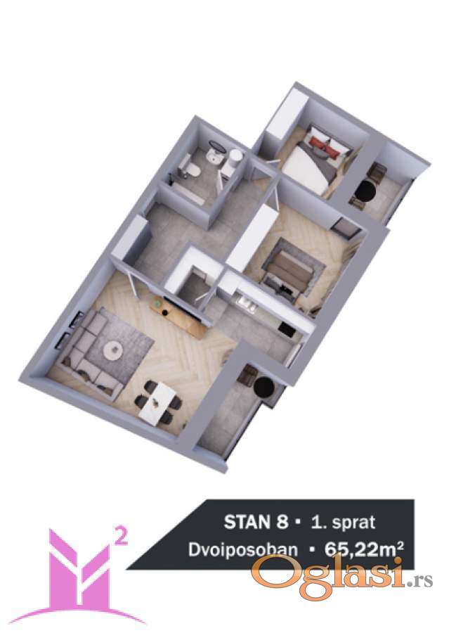 Nudimo Vam komforan porodični stan sa prostranom dnevnom sobom iz koje postoji izlaz na terasu, 2 odvojene spavaće sobe, iz jedne postoji izlaz na terasu, ostave koja je u sklopu kuhinje i kupatila.