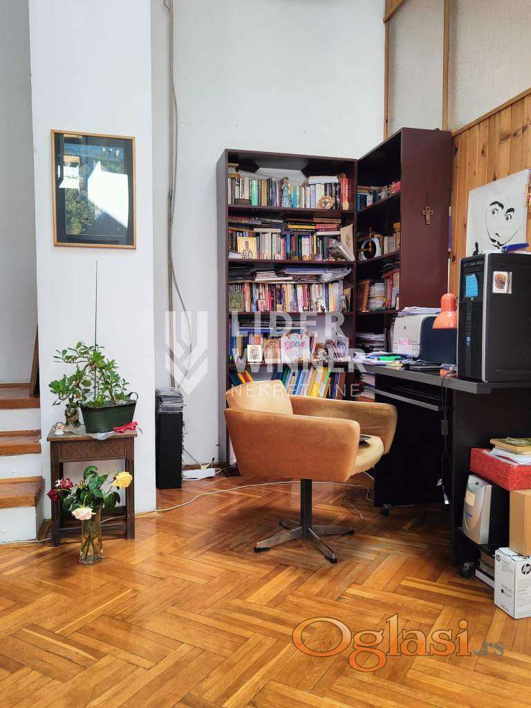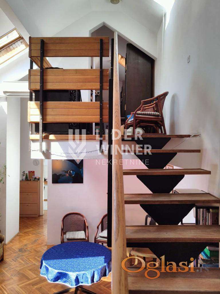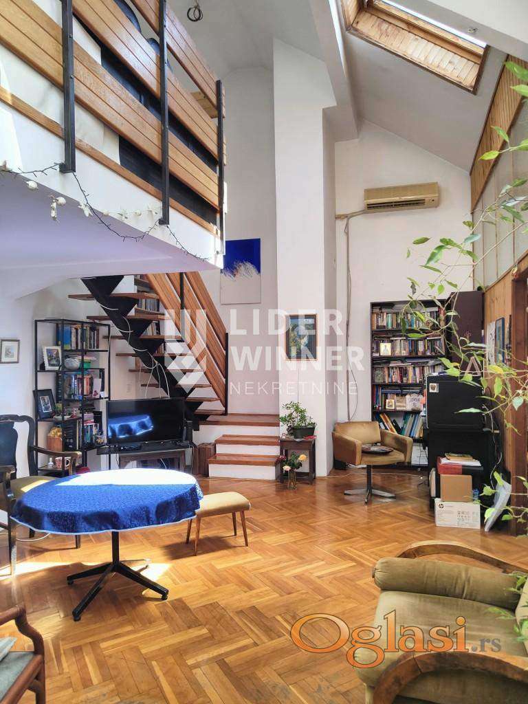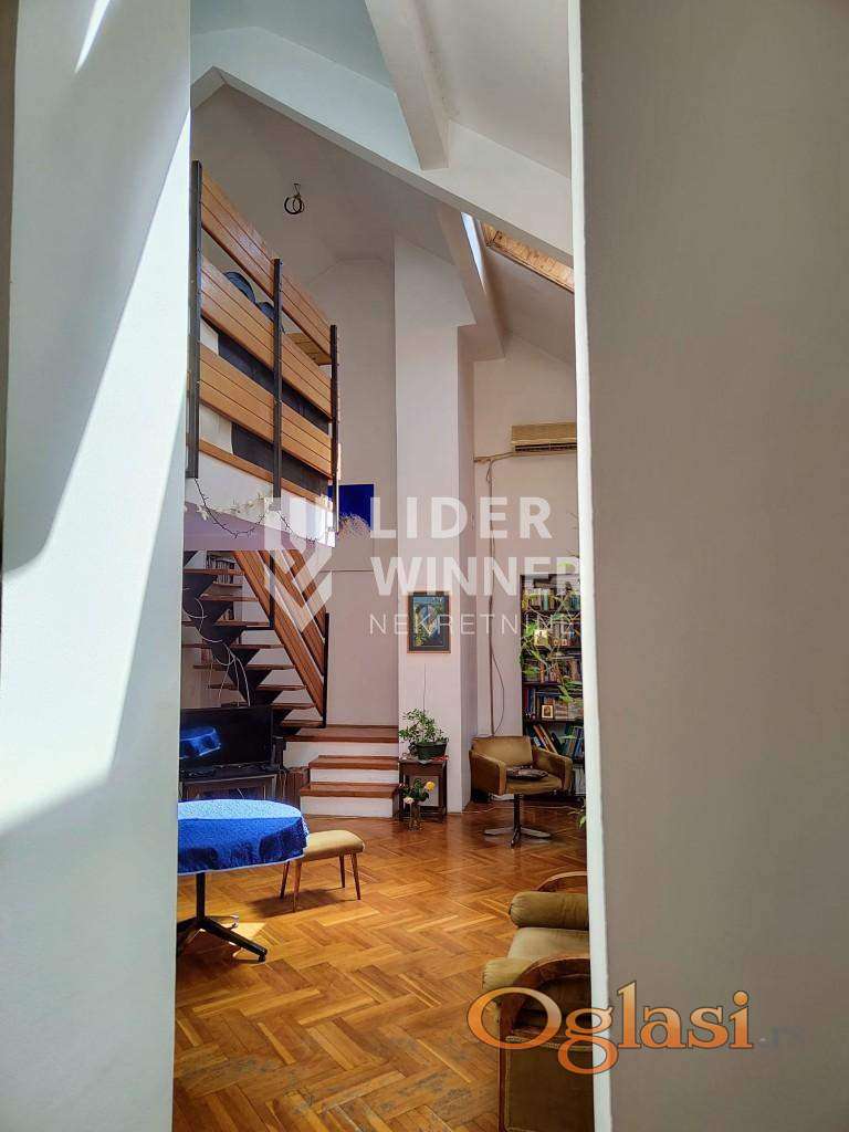 Atraktivan stan u Sokolskoj ulici, izvorno projektovan kao stan atelje. Visna plafona je 5m sa blagim kosinama. U donjem nivou je dnevni boravak, hodnik, kuhinja, kupatilo, 2 spavaće sobe. Na gornjem nivou je galerija od 10m2 + natkrivena terasa. agencijska provizija 2%